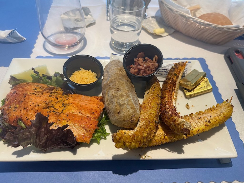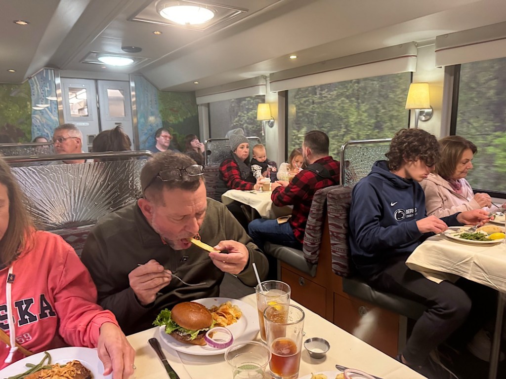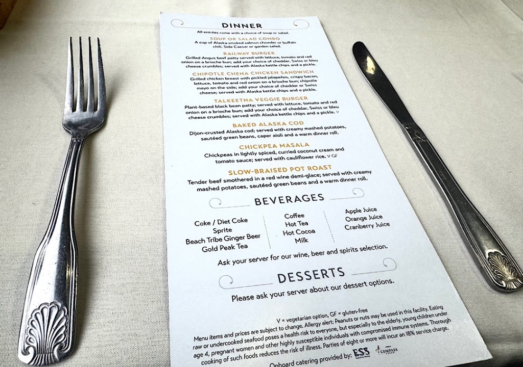 … we ate well (breakfast on the four-hour Fairbanks to Denali run; lunch and dinner on the seven and a half hours from Denali to Anchorage.)