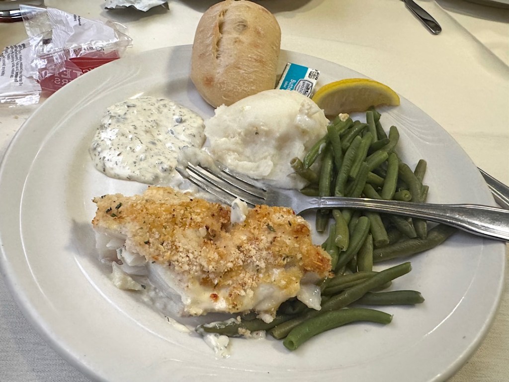 The dinner menuMy baked Alaska codThe bar, located upstairs. Our ticket included two alcohol drinks per meal. (We abstained at breakfast and lunch.)