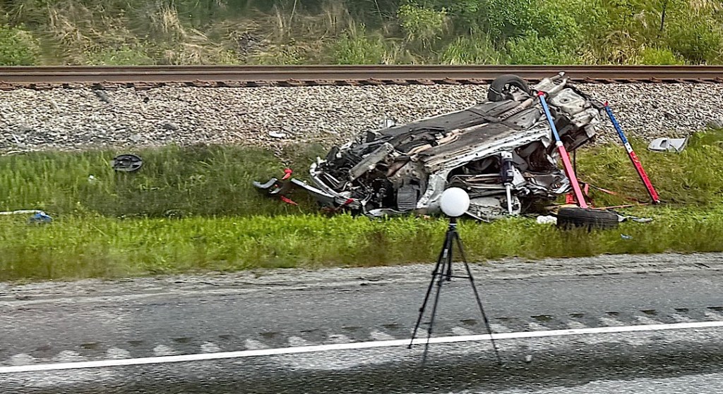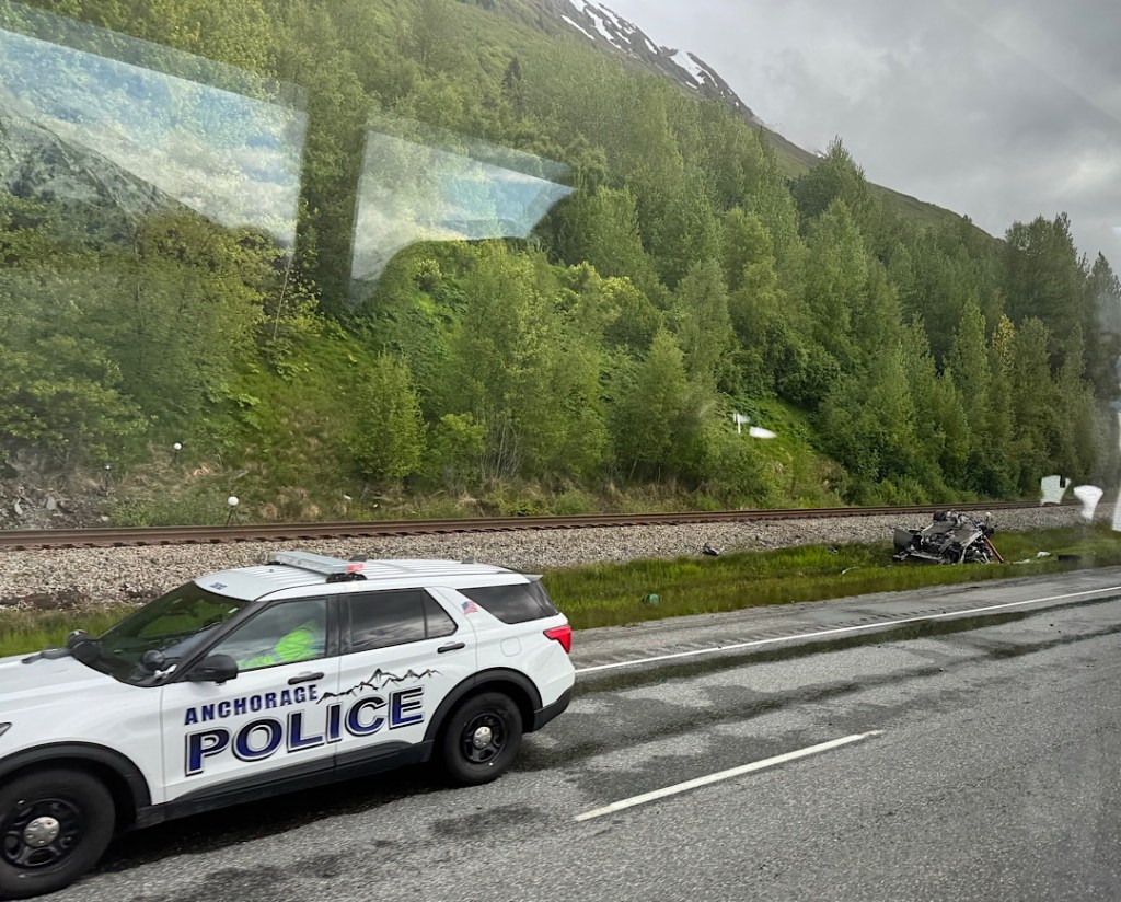 An hour passed and we finished breakfast. Gossip about what had happened began percolating throughout the cars. We learned that 40 miles or so down the track, near Girdwood, a motorist had lost control of his car and flipped (four times, we later heard). In the course of this thrill ride he bounced off the track before smashing to a halt and dying.