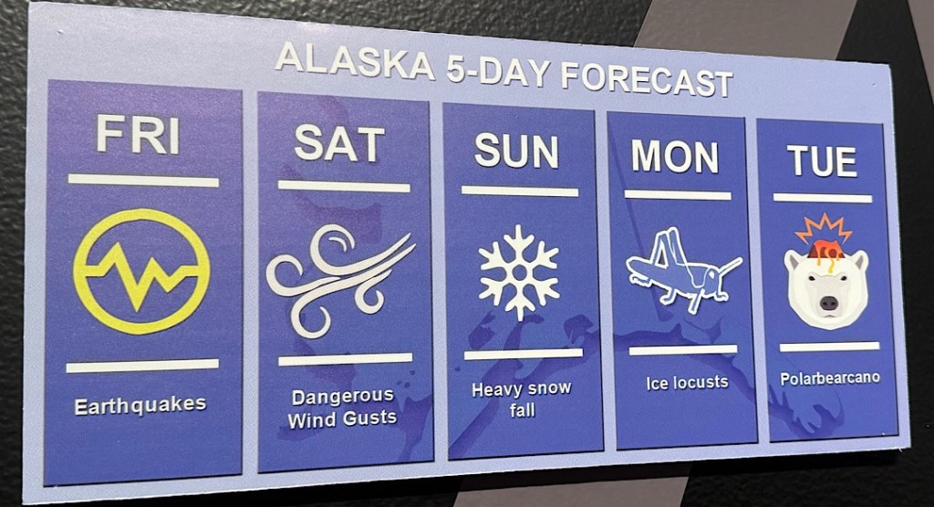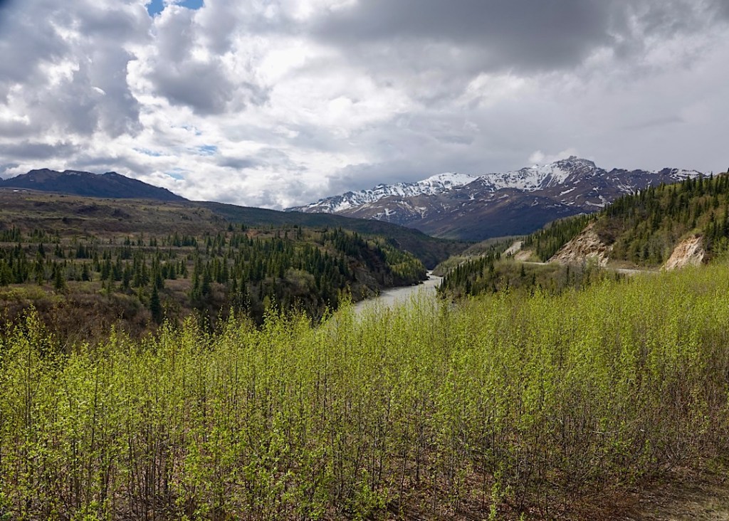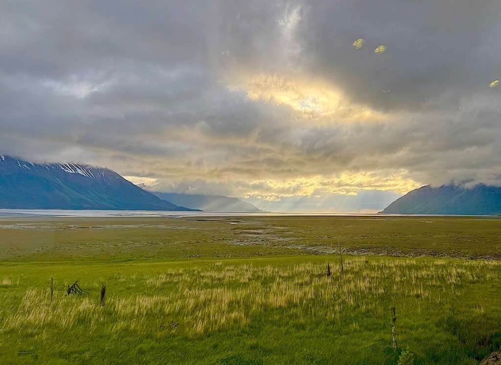 She was perky and earnest. She said every time one of these bad things had happened, something wonderful had compensated for it. Once the train had been scheduled to arrive at 10:15 pm but didn’t get in until two in the morning. In the midst of the delays, a magnificent display of the aurora borealis began lighting up the sky, thrilling everyone on board. Or, on this run, the bartender pointed out, as we’d waited just outside the Anchorage depot, we’d been treated to the sight of a nearby foraging black bear. (I saw him but didn’t manage to capture the sighting with my phone.)