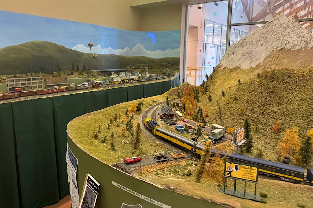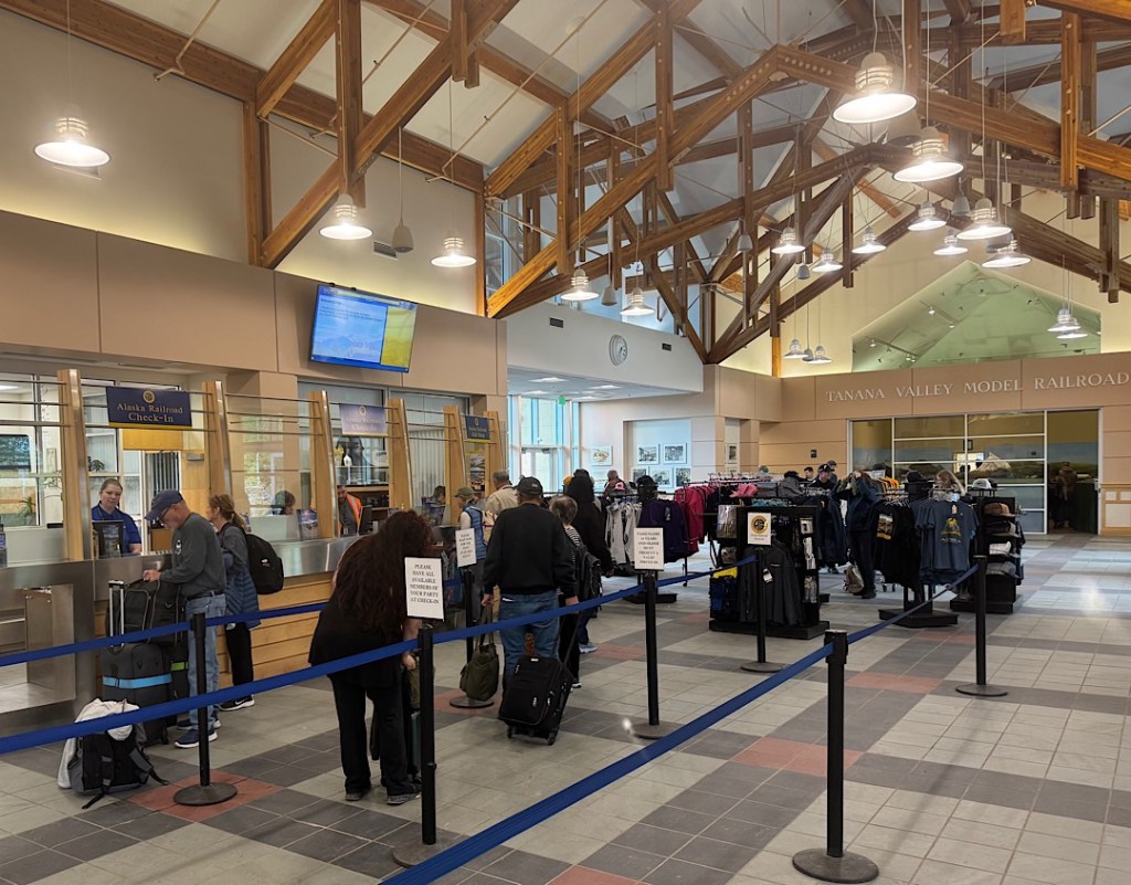 When Steve and I walked into the Fairbanks train depot (11 days ago) for the first leg of our Great Alaskan Railway adventure, we exclaimed almost in the same breath: this can’t be Amtrak. The depot was pretty and clean. The ticket sellers cheerful and efficient. To entertain waiting passengers, an elaborate model-train track had been set up in a side chamber. I wouldn’t say it all exceeded anything we saw in Japan last fall. But it wasn’t disgraceful.