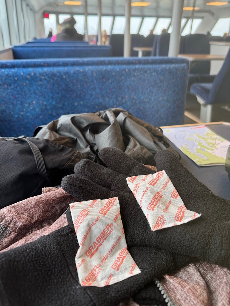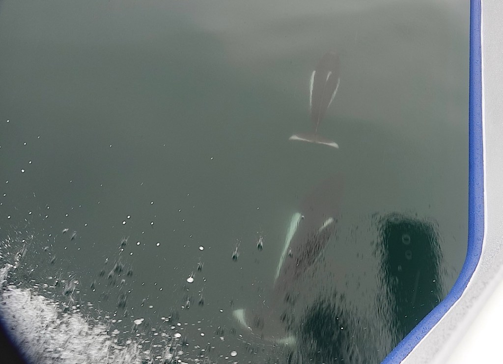 The world looked darker and colder when we got up the next day (Sunday). I checked in for our 8.5-hour-long cruise to the glaciers, and the girls behind the counter wore pained expressions. They warned that if the sea got much rougher, our captain might have to cut our trip short. Things could possibly improve a bit the next day, they suggested, so we switched Sunday’s glacier tour for the four-hour orca cruise we’d been scheduled to take Monday.
