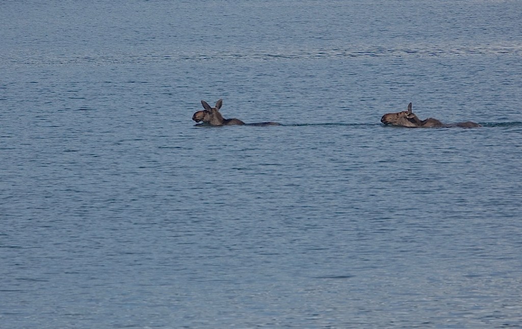 A bit after 9:30, someone shouted and pointed to two dots in the distance: two moose swimming across the fjord!