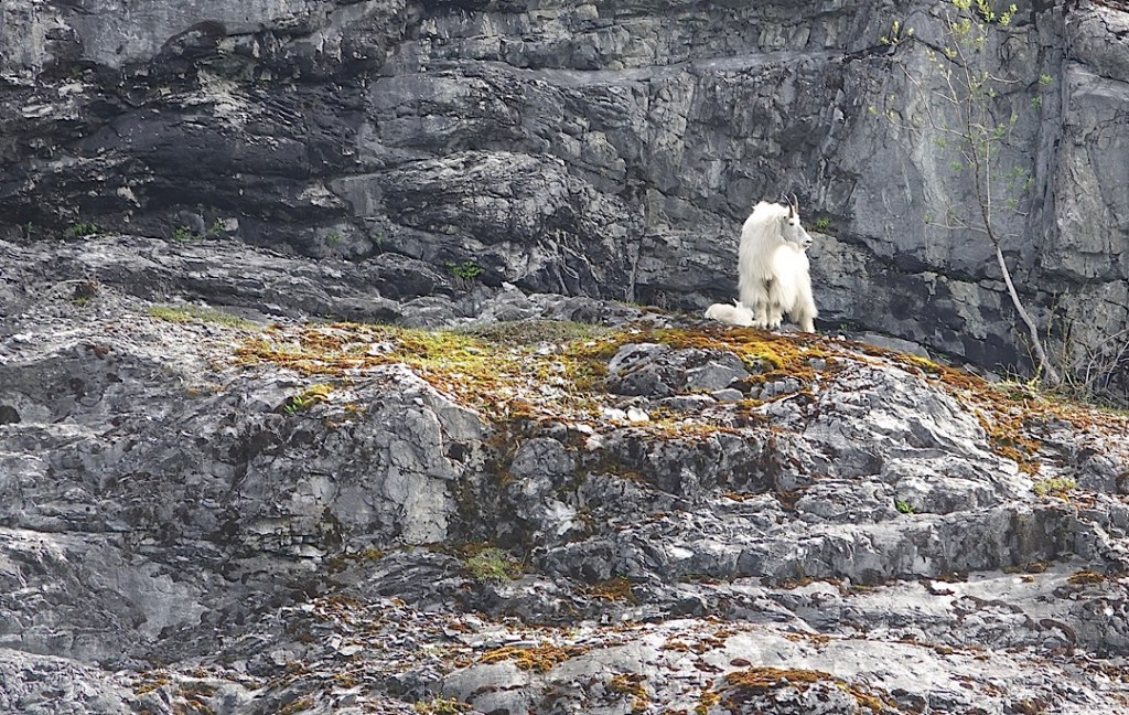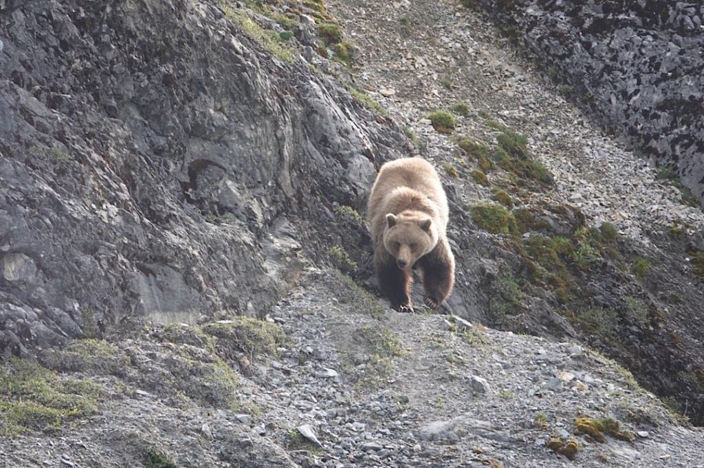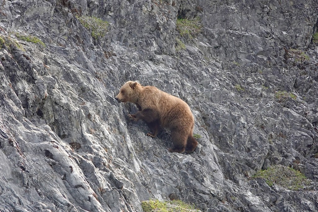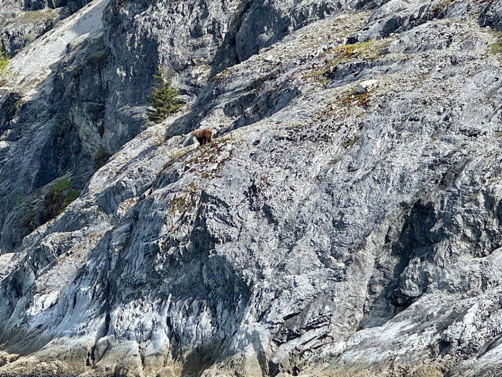 The boat’s crew members told us how rare this sight was. And mysterious! Moose lack heavy insulating coats or significant body fat. What would motivate them to cross the freezing channel? Even our onboard park ranger (Hailey) seemed mystified. The sight would have enthralled most boatloads of tourists for some time. But a new cry shifted our focus to the other side of the catamaran. On the cliffside ahead, the form of a brown (aka grizzly) bear was moving.