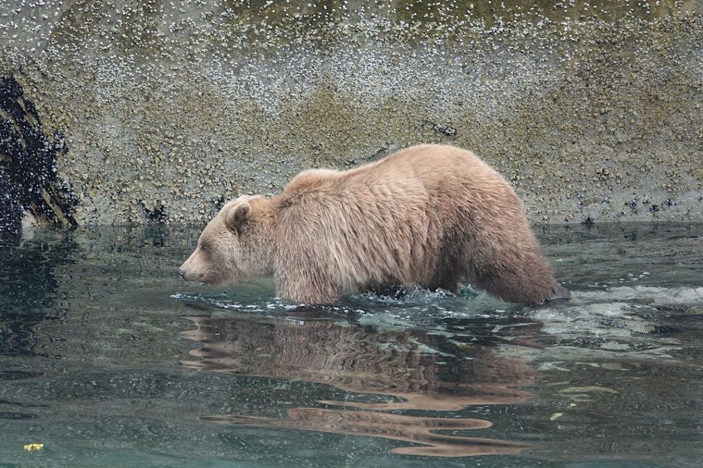 The captain maneuvered us closer and we watched the bear climb a remarkably steep rock face.He seemed to think better of that and descended. He stood just 25-30 yards from the boat. That’s just a quarter of the minimal distance humans are warned to keep between themselves and grizzlies. He seemed to be pondering the situation.Then he moved down and waded in.Again he seemed to change his mind. He stood there dripping.