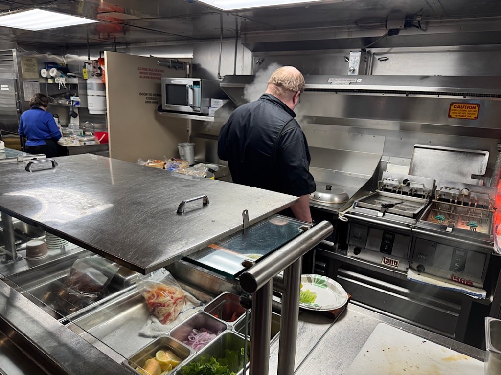 A more informal snack bar provided basic options: grab-and-go sandwiches; fish and chips and burgers served up by a burly old-school fry cook.