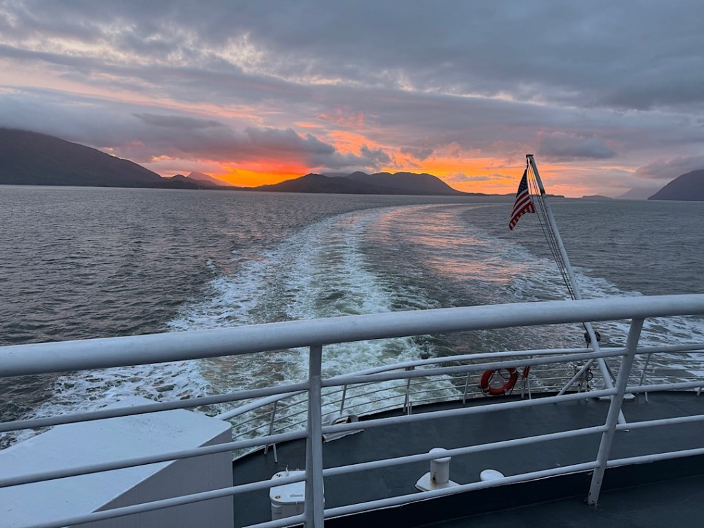 Almost 45 years ago, I rode a train I will never forget. Steve and I boarded it at night in London and settled into a sleeping car that was hauled to somewhere on the British coast. I remember waking up to a lot of clanging and banging as our car was uncoupled from the British engine and loaded on the vessel that would carry it across the English Channel. On the other side, the French hooked it up to another engine that pulled us all the way to Paris, where we disembarked. Although once an emblem of the glory days of rail, the “boat train” was being discontinued; I no longer remember how we managed to get tickets on its final run. But I’ve thought of it as we’ve ridden on an Alaskan ferry these last two and a half days.