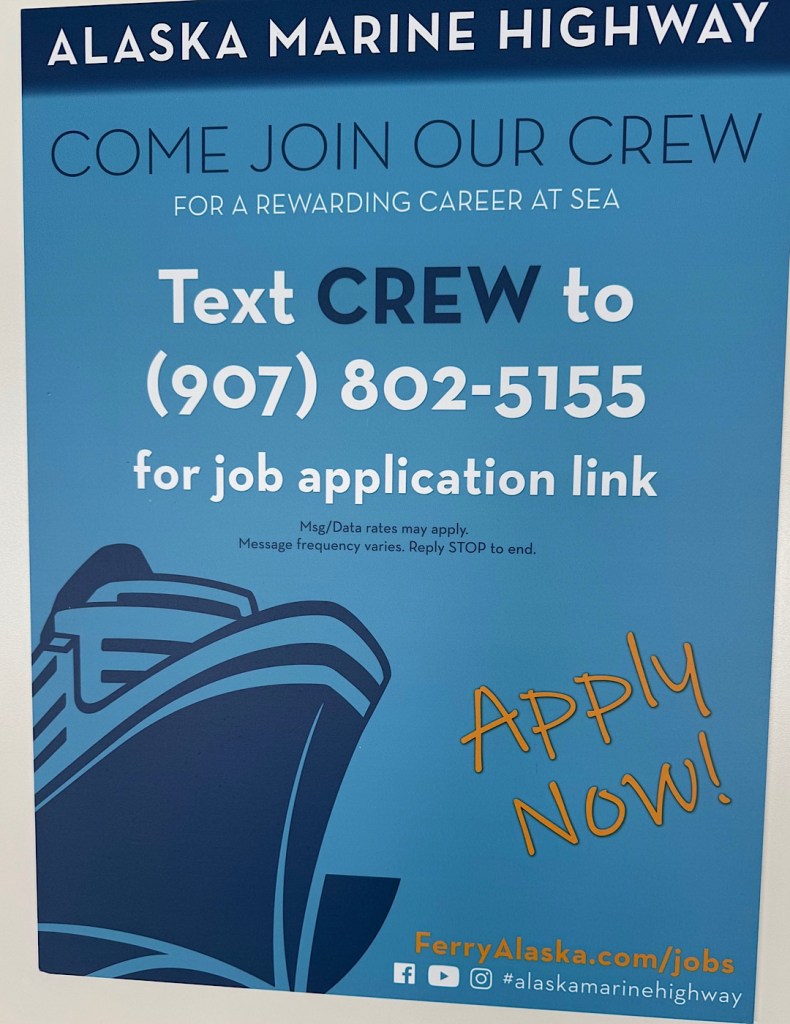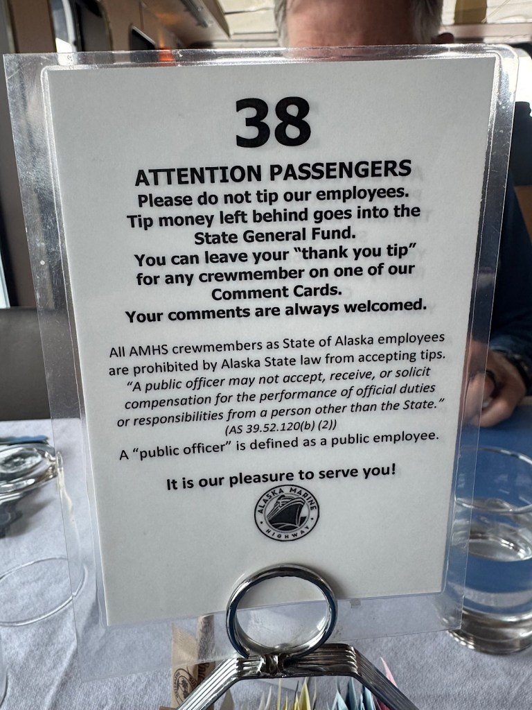 I’m not sure what could or should save the ferries. But I can — now — say IF Alaska’s ferries disappear I’ll be sad. Steve and I rode for 5 hours on the MV Hubbard from Juneau to Gustavus, then we wrapped up our Alaska adventure by spending almost 60 hours on the MV Columbia as it bore us almost 1000 miles from Sitka to Bellingham in Washington. Both rides were extraordinarily soothing.