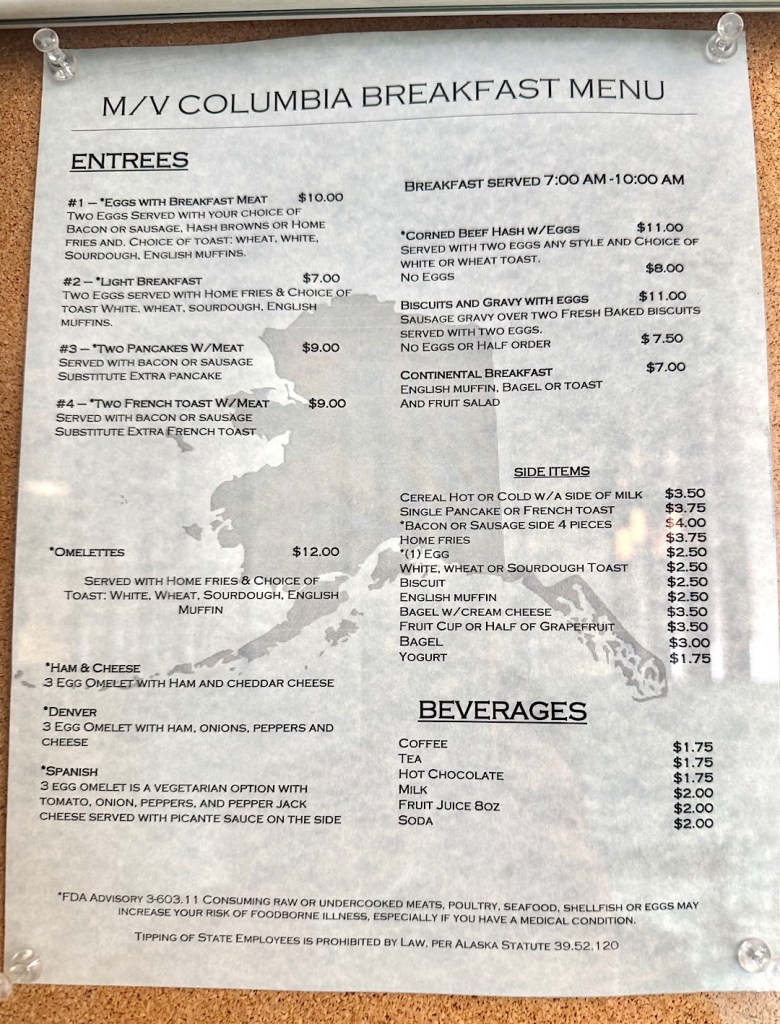 In the ship’s pretty, old-fashioned dining room, uniformed waiters served breakfast and dinner daily, and the prices were startling — roughly half what we’d seen anywhere else in Alaska.
