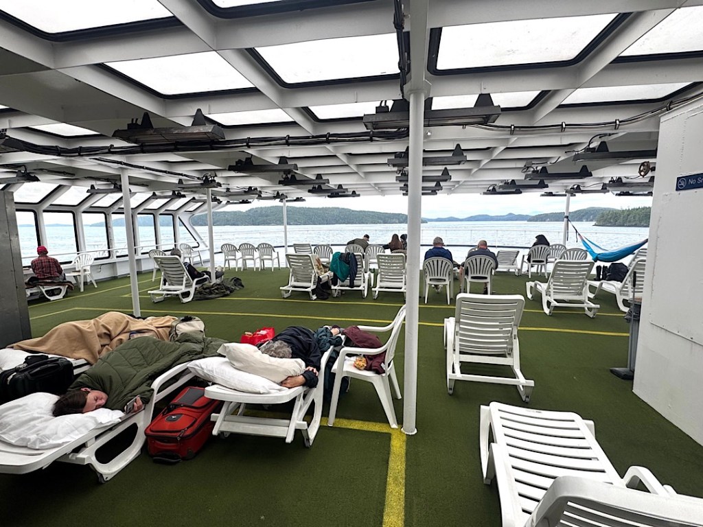 Most important: we tied up in Bellingham minutes before 8 am Friday, just as scheduled. If the occasional swells made anyone seasick, I wasn’t aware of it. I enjoyed hour after hour of views of the Inside Passage, a waterway that had intrigued me as long as I can remember. In my mind, it’s real now, a gift no flyover can bestow. If the Alaska ferries cease to exist, this ride will rank right up there with the boat train.