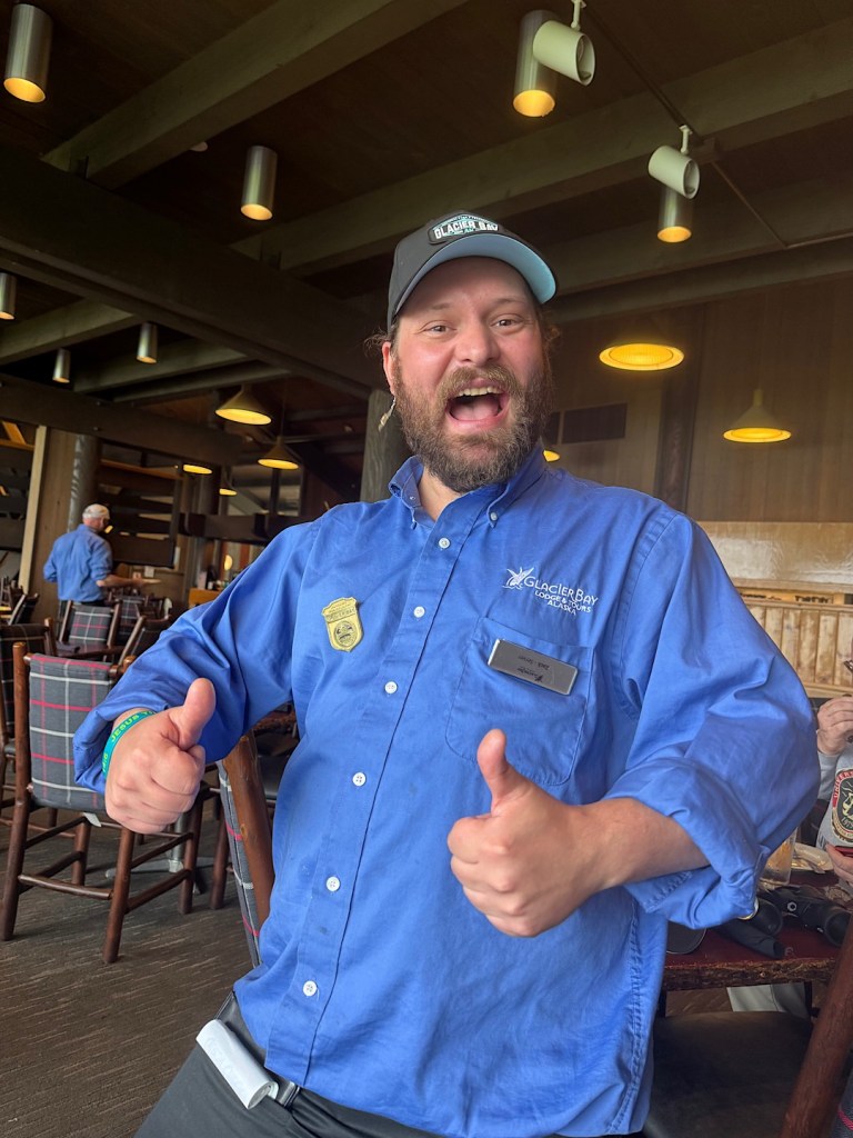 This is Zack, 31, originally from Florida, who’s working for the summer as a food server at the Glacier Bay Lodge. Zach shared so much about his life with us, I could tell you a LOT more. But I’ll refrain.