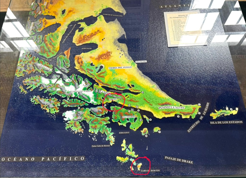 Like Juneau when we were last May, Ushuaia in these last days of the Southern Hemisphere’s summer felt colder than San Diego on its frostiest winter days. It’s not part of a huge land mass, as Alaska is, and as a result, Tierra del Fuego never gets anywhere near as cold as the 50th US state. Tierra del Fuego is an island, shared by Chile and Argentina, and about 100 miles north of Cape Horn, the southernmost point of the Americas.