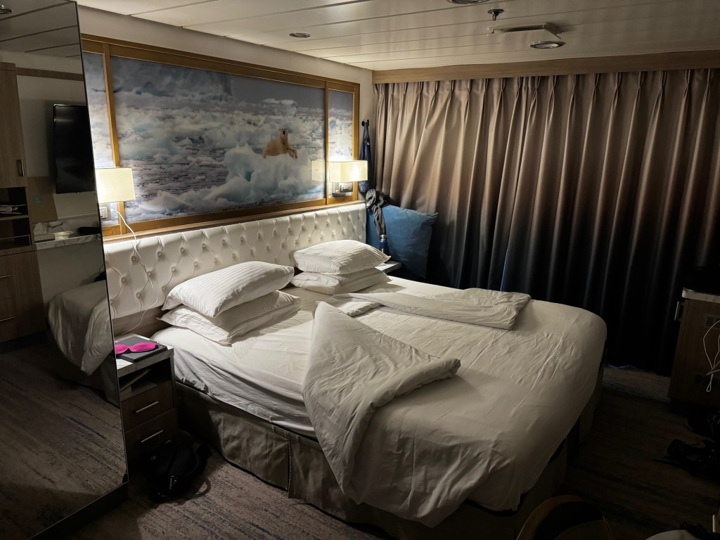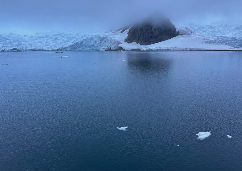 At the moment, hundreds of bits of ice float in front of a gigantic glacier. At other times, the sea’s been blustery. I can prop myself up with pillows on our big bed and feel no need to snuggle under a comforter. I normally dislike being coddled, but this feels surprisingly pleasant.