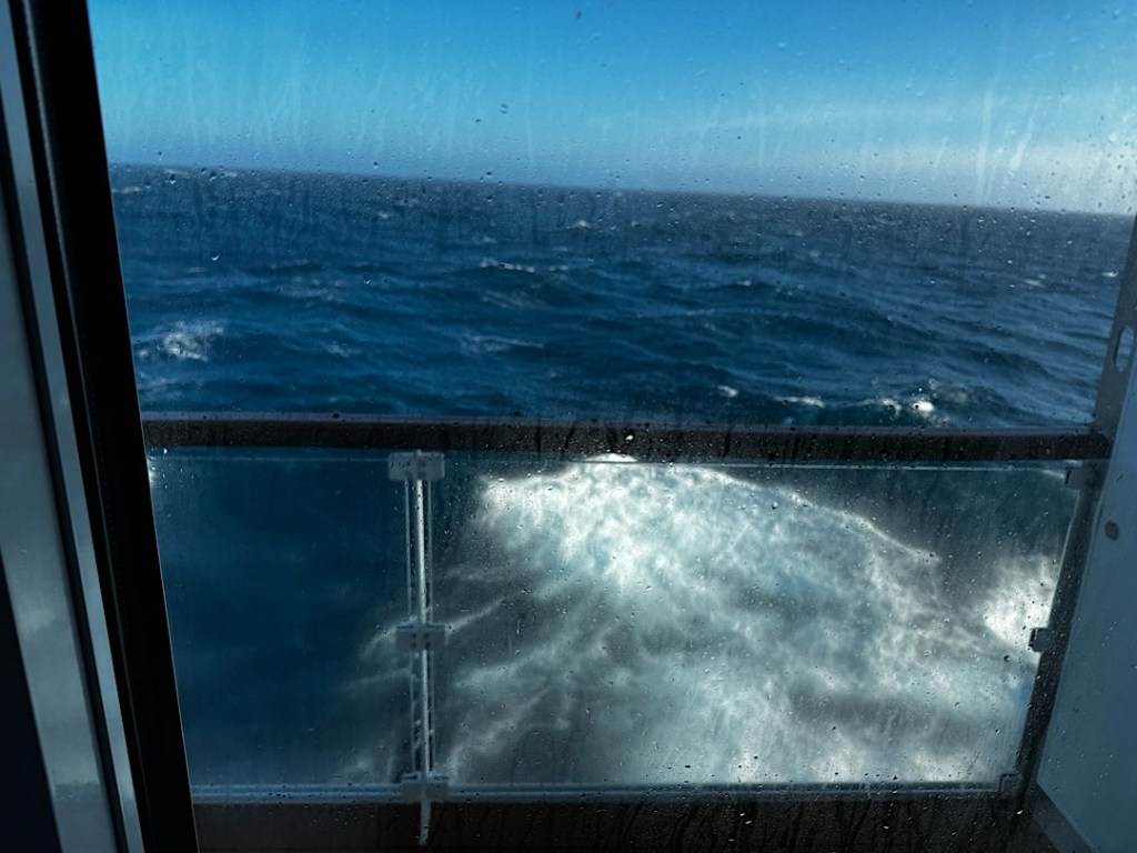 At least a few of our fellow passengers really, really wanted to see them, though. The rocky knobs that make up Sandwichland (as Cook originally called it) are very small but they’re home to an enormous colony of chinstrap penguins. Still, Gaby made it clear why the captain and she felt compelled to change our plans. An intense storm system is racing toward the area. We’re on its edge, and that’s been pretty harrowing. Outside our windows, the sea froths with white caps, rising up in 10-foot swells. The wind is gusting at 35-45 miles per hour.