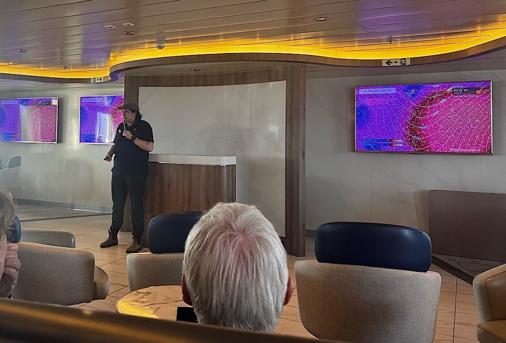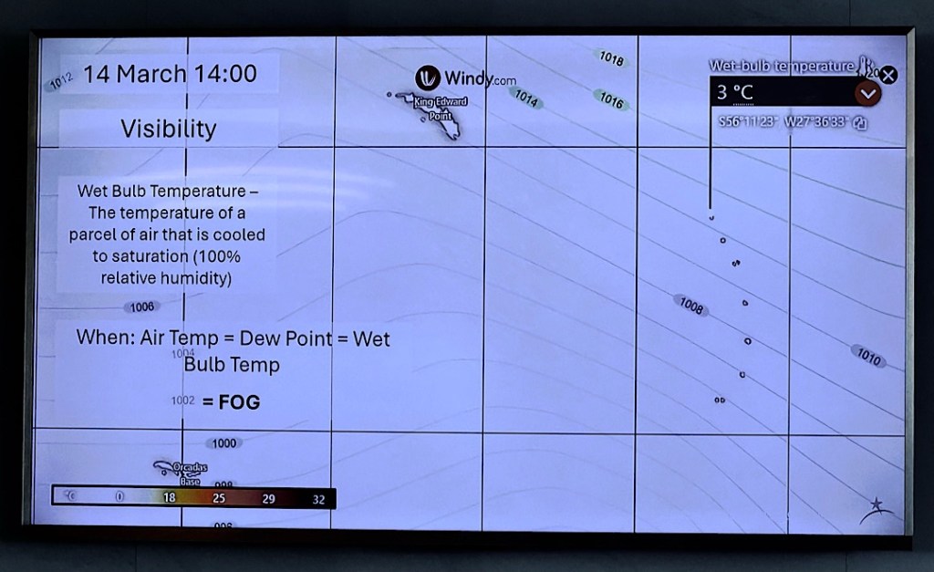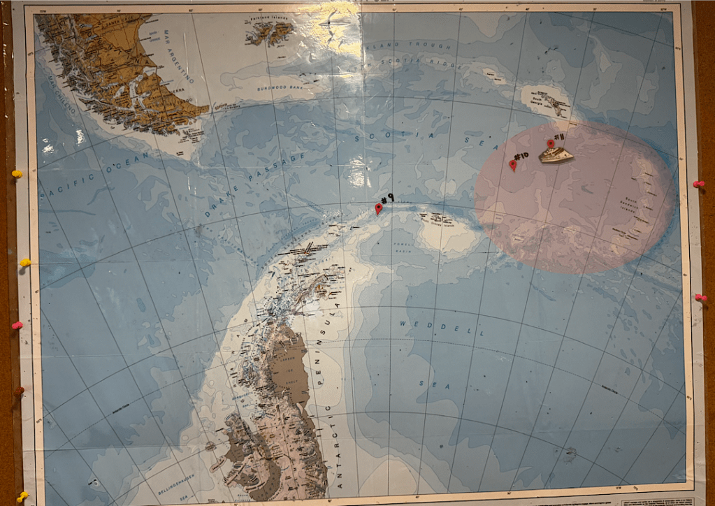 At our present location, it’s sunny at the moment, which makes it less scary (though some folks are seasick again. Happily, not me.) But Gaby says the South Sandwich area is certain to be socked in with fog.