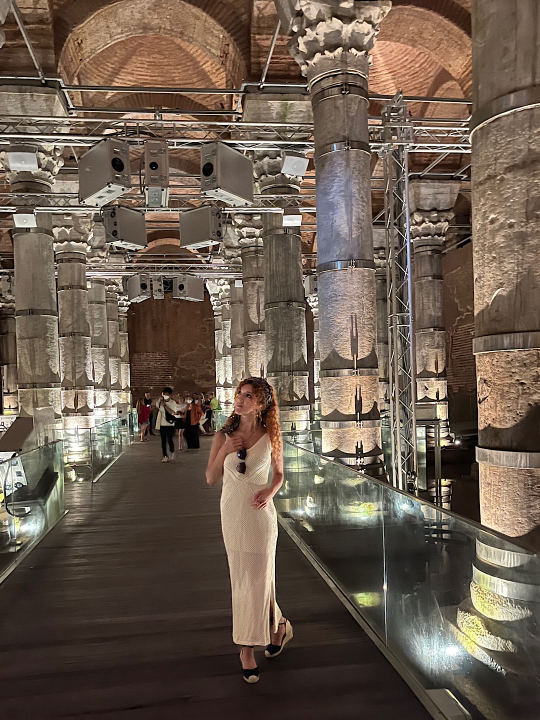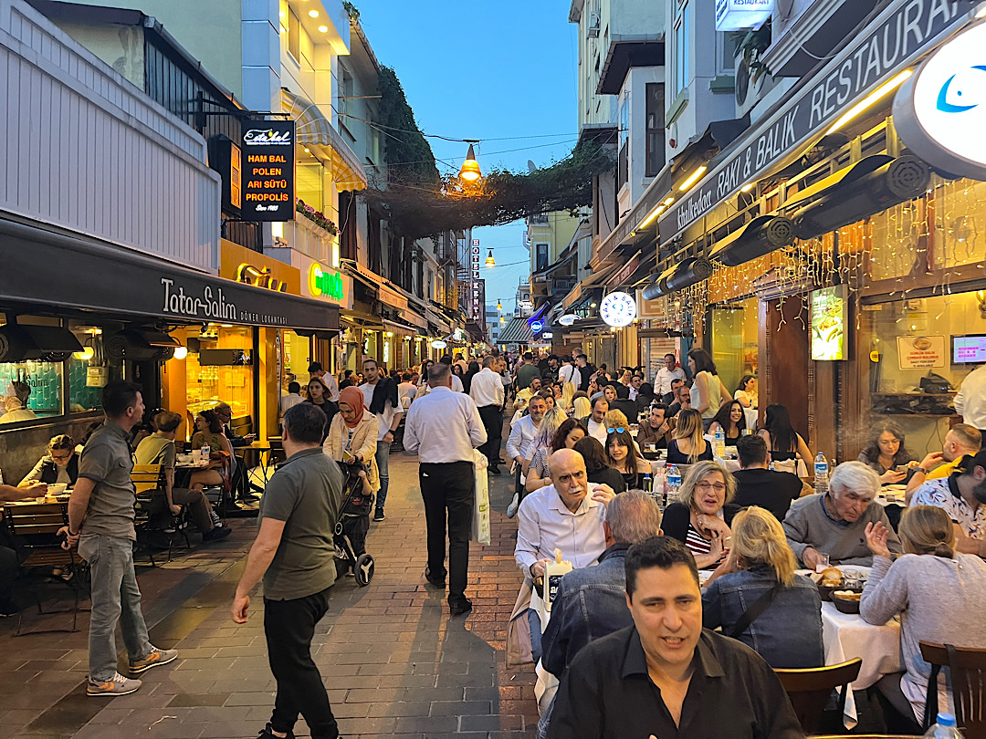 We pulled on a clear glass door and climbed up a steep set of steps to find a dimly lit L-shaped space lined with two levels of benches. I was startled by how packed it was. I’d had to make a reservation for 3:15 precisely, which I’d assumed was intended to control overcrowding. But the benches were so full it was hard for us to find a space to squeeze into. Once we did, I sized up the folks around us in the gloom. The vast majority looked to be in their 20s or 30s, with young men outnumbering the women. Some exchanged short comments with each other, and we heard some British accents, but clearly this wasn’t a conversation space. In short order, I started sweating, and the heat intensified whenever someone threw a dipper of water into the heating contraption at the base of the steps. After maybe 5 minutes, I was ready to get out.