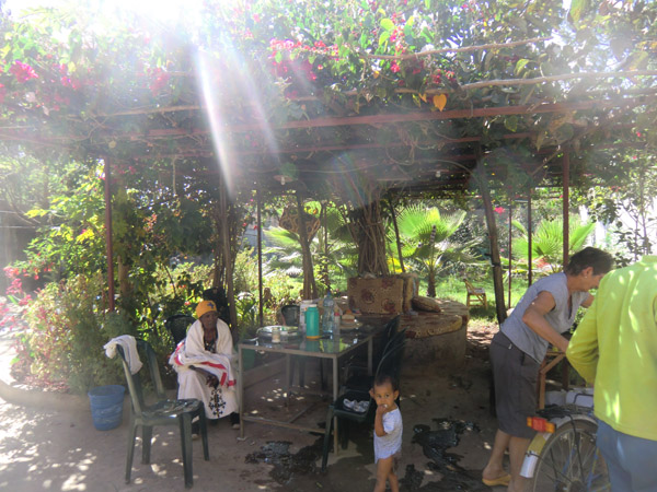 It’s pretty intense, tiring, if riveting. Still I’m glad we journeyed here. Rowda’s clean, quiet domicile is a delight, and the breakfasts of coffee, fried pastry dough, and honey are delicious. (The tab for all this is $21 a night.) I also loved our outing to visit the hyena man last night.