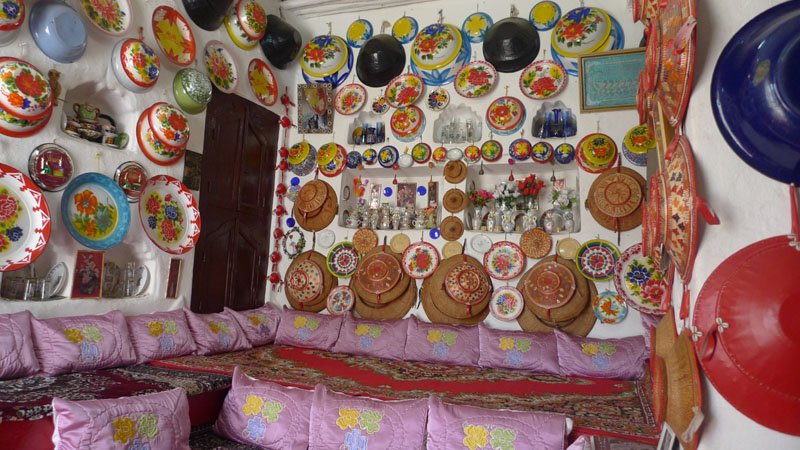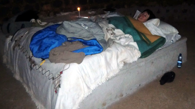 two bathrooms are located outdoors, off the central courtyard. Competing for them are seven of us guests, squeezed into every spare sleeping space on the premises. Although there are only three real guest rooms, upon our arrival we found two dumpy French women camped out in the courtyard, pouting and complaining loudly. They claimed that they had made their reservation back in September, and they were outraged that Rowda didn’t have rooms for them. (Later, we heard from our guide that some intermediary had screwed up. Whatever he’d told the French women, this guy had only tried to make their reservation the day before, when all the rooms were booked.) More than once, the women exclaimed, “c’est l’Afrique!” (“that’s Africa for you!”) in contemptuous tones. Despite this rudeness, Rowda apparently agreed to accommodate them by setting up a bed for one in the central salon, while stashing the other in a bed in the hallway that was once reserved for newlyweds.