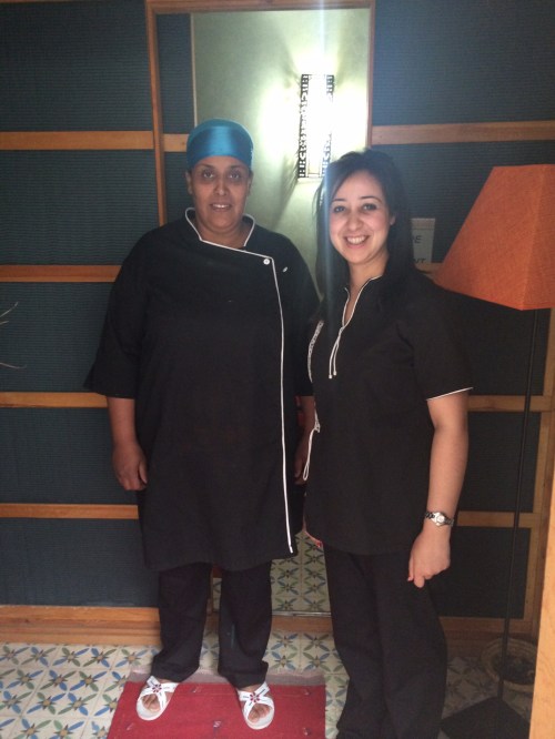At 3 p.m. I showed up wearing only the flip-flops and thick white robe that had been deposited in our room. A sturdy woman wearing a long black tunic and a headband directed me to the room to the right. She pour a bucket of hot water over the plastic mat on the concrete table within it, then she had me take off the robe and lay down. For the next half hour or so, she poured cupfuls of warm water over me then went through an elaborate cleaning ritual that started with applying soft aromatic liquid soap and worked its way up to a vigorous whole-body scrub with an abrasive mitt and something she said was black soap. By the time she was done, she’d peeled off at least one (and maybe several) layers of my skin. She applied a facial mask too and she shampooed my hair and finished me off with more rinsing. I re-donned the robe, moved into the central sitting area for a cup of sweet mint tea then went on to be massaged by another young Moroccan women (deeply relaxing but much less weird.)