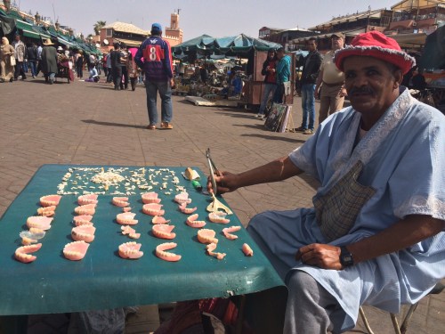 These were real cobras and vipers, mind you. And other men had what looked to me to be real Barbary apes, wearing diapers and trained to pose with photographic subjects on demand. If the snakes and monkeys were clearly there for the tourists, almost everything else in the plaza seemed intended for local consumption. There are the “dentists,” for example, who sit at tables laden with dentures…and a pair of pliers. We paid another 10 dirhams to photograph this fellow:
