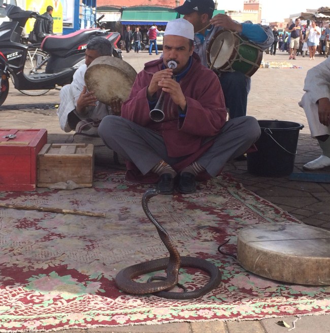 We saw only one or two snake charmers.But later that morning, when we walked through the plaza again on our way back from visiting the Artisanal Arts center and making a brief foray into the souks, I counted several more of the serpent guys, and I paid 10 dirham (about $1.25) to take this photo: