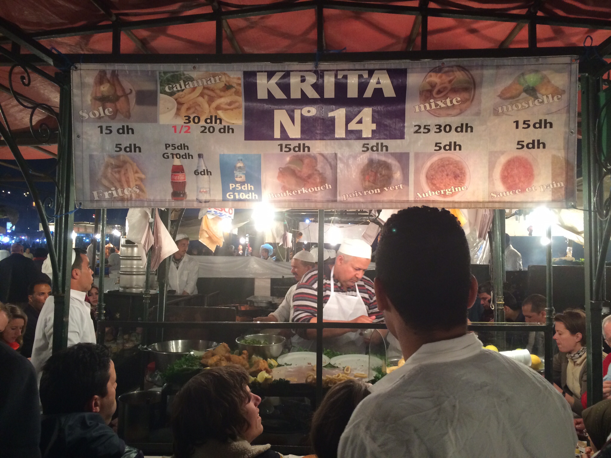 On Monday night, Steve and I had walked about 10 minutes from the square to find a simple Moroccan restaurant recommended by a friend. But when we’d passed through the square, we’d been assailed by at least two dozen touts, each insisting that his employer’s restaurant was the best. We’d told everyone “Maybe later.” But we’d been struck by how the places that were jammed with mainly locals didn’t seem to have any touts — probably because their good reputations were pulled regular customers in.