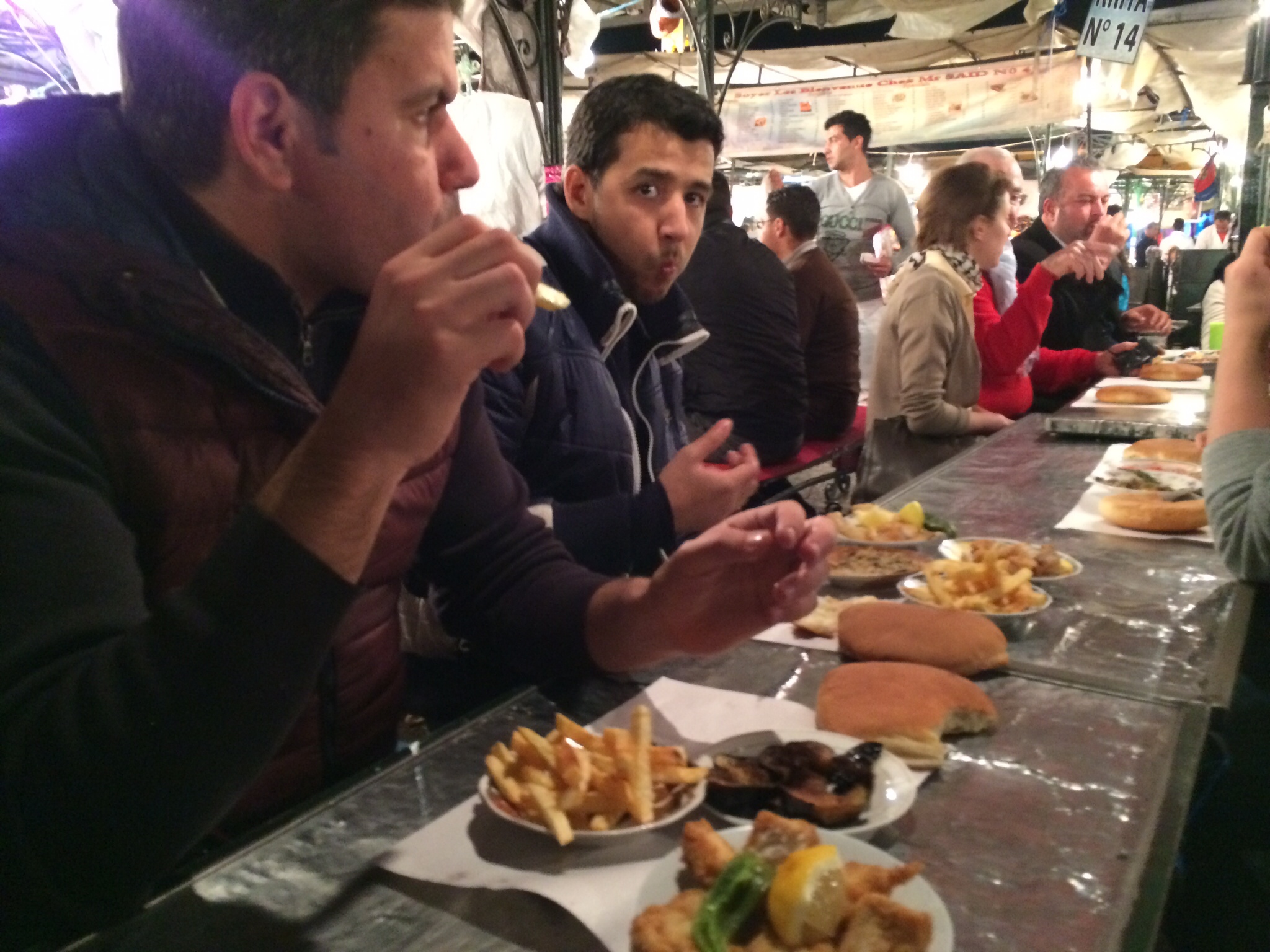 We’d failed to study the little menu/sign in front of this stall, but the guy serving our section took command, delivering a little plate of tasty mashed roasted eggplant, then pureed fresh tomatoes, then a pile of fried fish chunks that, if bony, tasted very fresh. The pile of fries that he brought were good too. All that would have been enough, but he also dropped off a plate of fried calamari (which we later learned cost 30 dirhams — about $3.75 — by itself.)