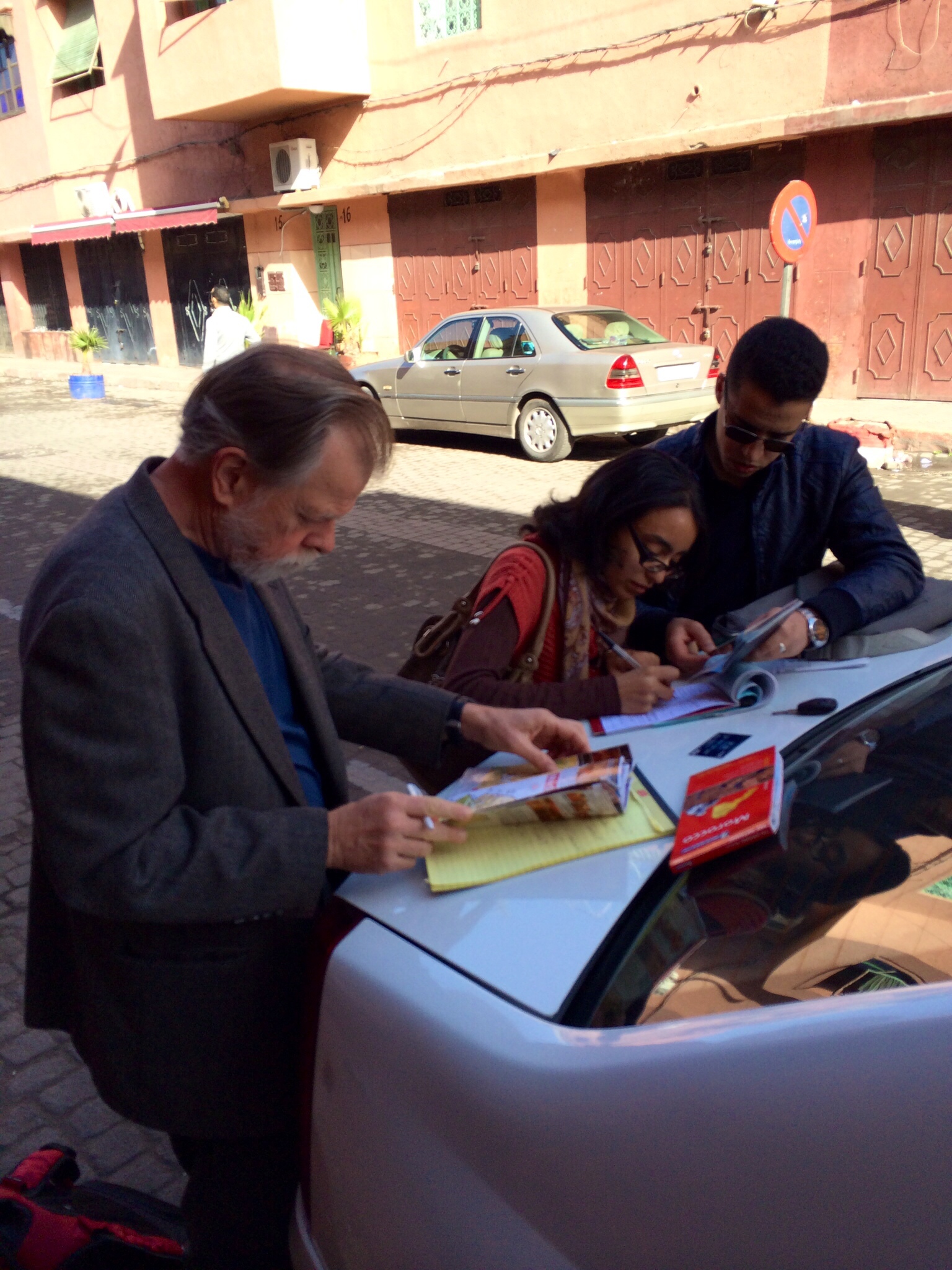 and a credit-card-processing machine to log our deposit and vehicle-rental payment. They patiently answered all our silly questions (“Do the windshield wipers work?” “What are the rules for entering a traffic circle?” etc.) When we got to asking about the details of how we should get out of Marrakech, they gallantly offered to drive us to the road out of town. And so they did! (Another colleague then collected them and took them back to the city.)