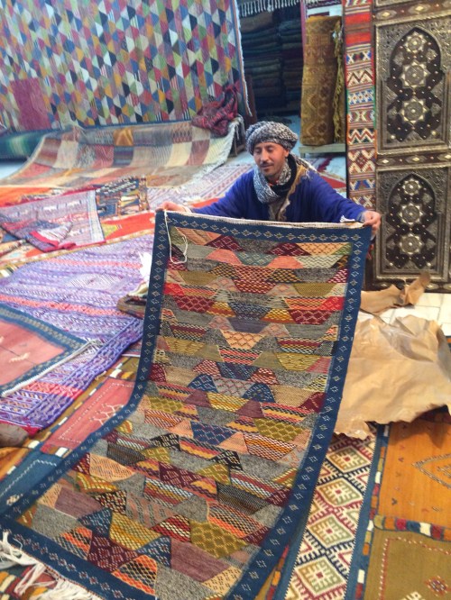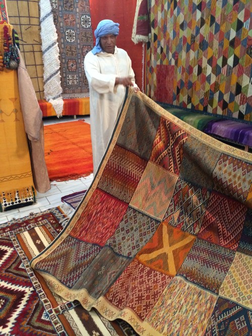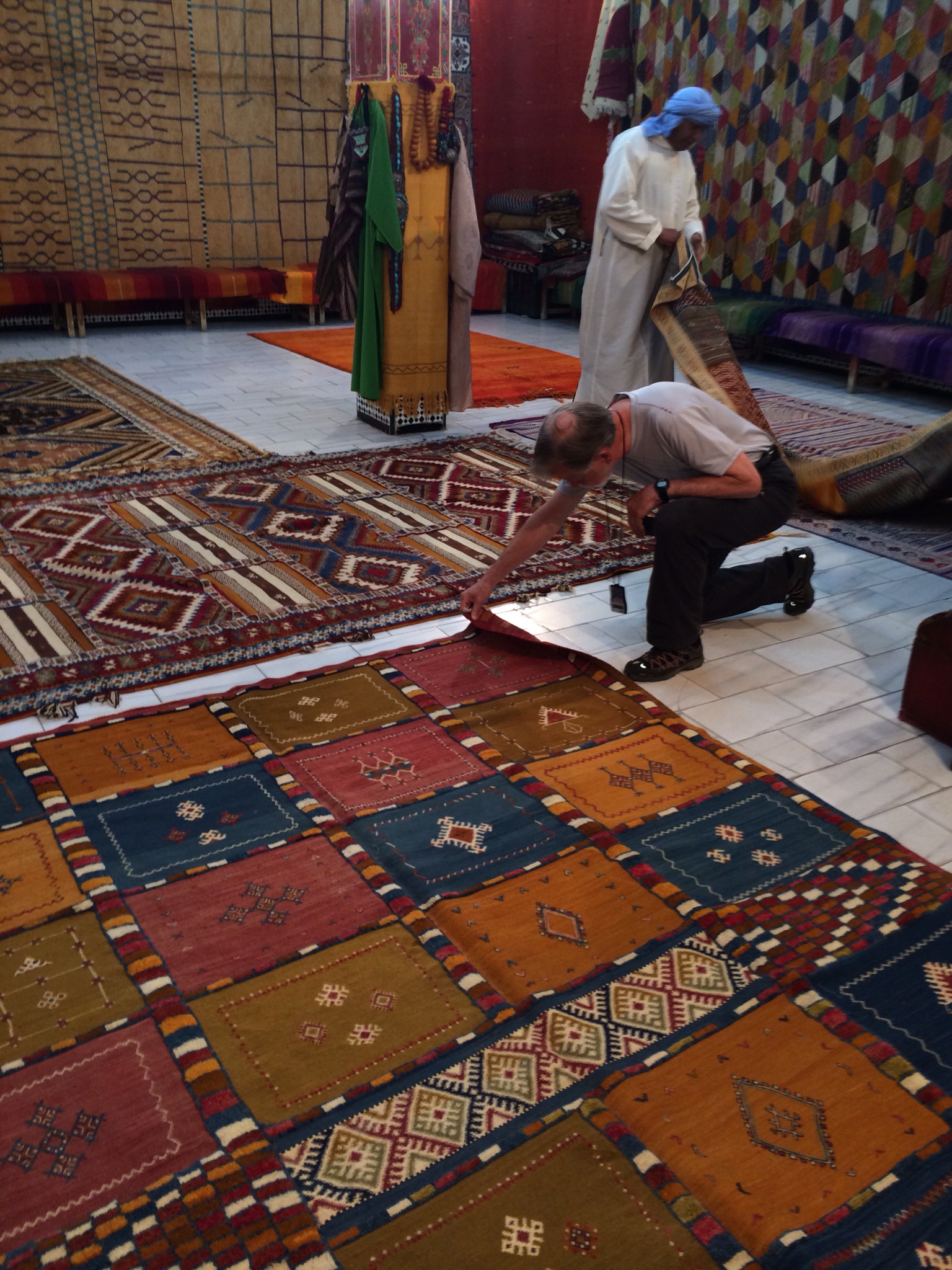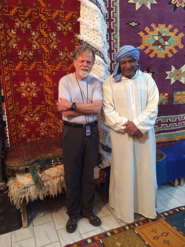 That’s not to say he’s much of a shopper. Neither of us is. But before embarking on this trip, I’d pointed out that we might want to buy some rugs in Morocco. Our living room rug has been peed on by at least a half-dozen puppies over the years. It looks pretty shabby. And we’ve never had any rug on the wood floor of our bedroom. I measured what we’d need for those spaces, and Steve grudgingly consented to do a bit of looking.