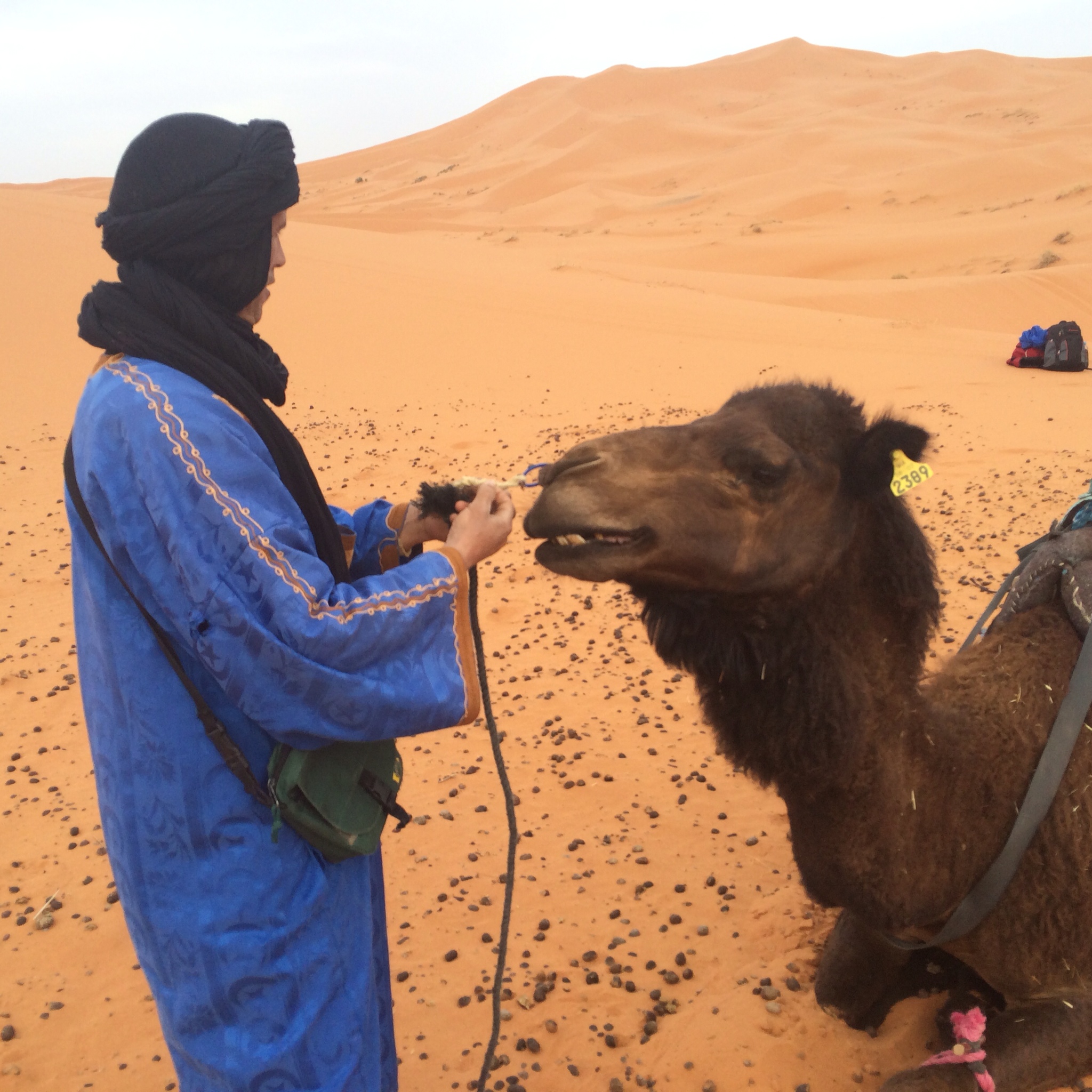 I had remembered camel-riding as being a pleasant rocking experience, and it was that at first as we left the village. But when the camels picked up speed, the ride felt more like being an a rocking horse on crack. Moving through sand dunes involves a lot of climbing and descending, and to keep from falling off, I tightly gripped the metal bar at the front of the “saddle.” It was fun. But after a few minutes, it was NOT comfortable. After less than an hour, my hands were cramping from the effort, and my lower back was informing me it would make its displeasure at this treatment known later.