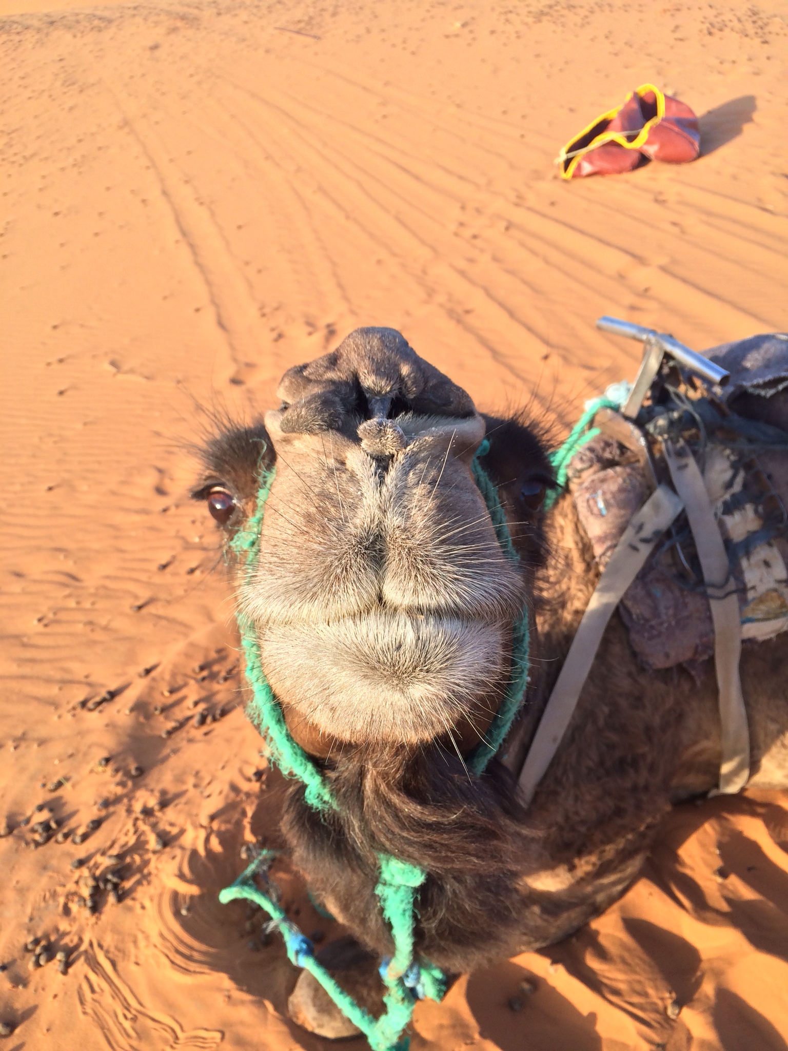 We’d ridden camels once before, for a short excursion in Aswan (Egypt), but this was a much more elaborate adventure, and shortly after 4 p.m. as we drove to the staging area (a few minutes from the guesthouse), my adrenaline was flowing. We had four travelling companions — a genial pair of lawyers from Brooklyn, their gregarious 9-year-old daughter, and her nanny — born in Morocco but even less experienced at camel-riding than S and me.