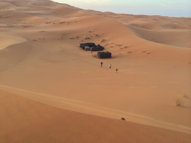 Still, the glories of the scenery made the discomforts fade into insignificance. The sands of Erg Cheggi are a beautiful peachy tan. In the warm light of the sinking sun, the landscape reminded me more than anything of flawless naked flesh, smooth and sensual. Some patches were pristine; others sprouted small patches of dried grass or sprinklings of camel poop (which looks a lot like dried out meatballs.) It’s strange and rare to be anywhere in the world today with no sharp angles. But this place is all long curving arcs and soft bends. It felt swollen with sinuous allure.