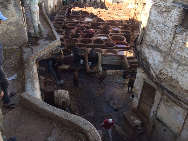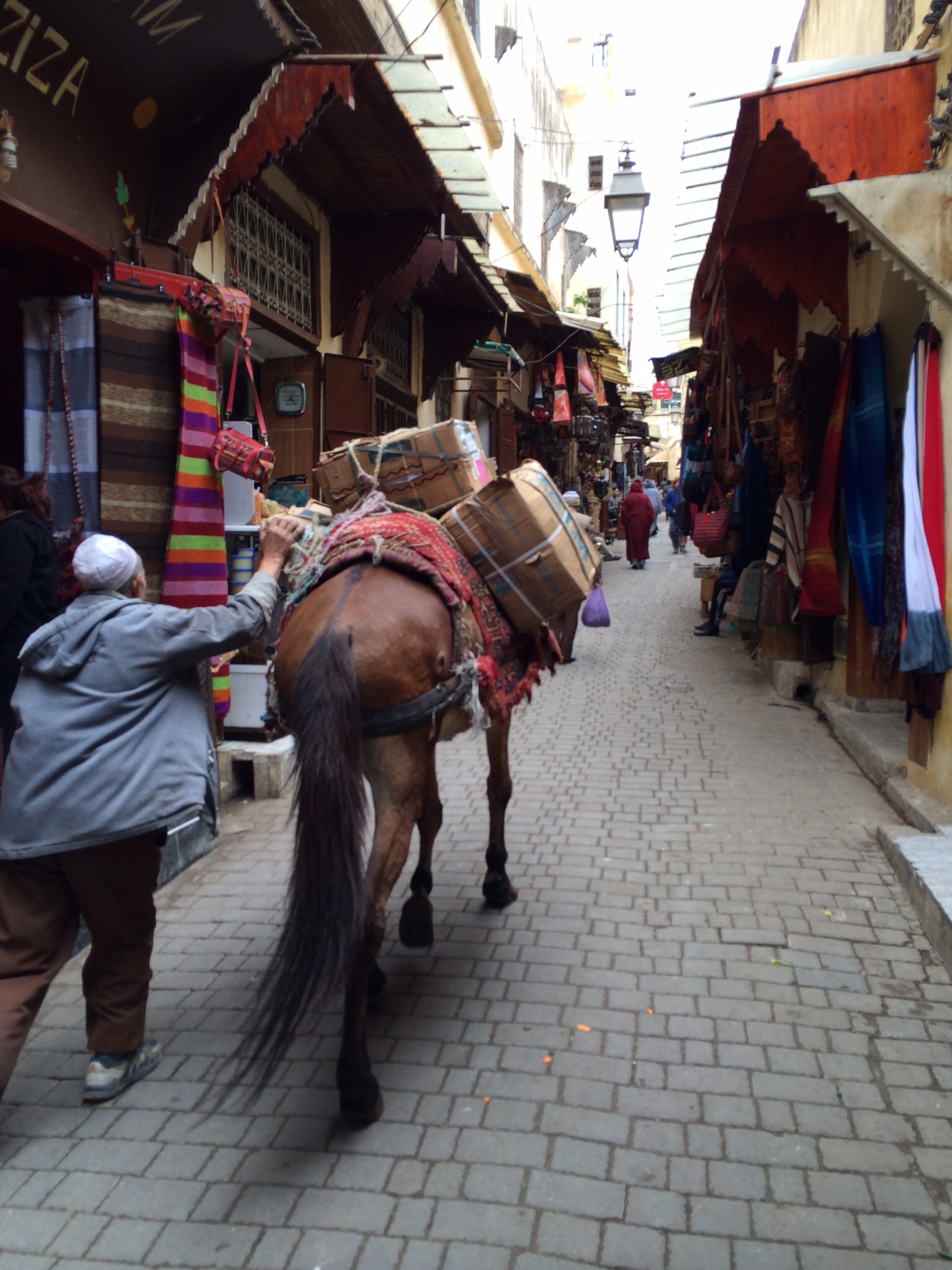 If there’s a travel article or guidebook to Fes that avoids using the phrase “sensory overload,” I haven’t seen it. The cliche is understandable. In addition to all the mind-boggling sights, you have to process the five times daily calls to prayer issuing from the hundreds of mosques, the crowing roosters, barking dogs, clattering and banging and sawing of the artisans. Smells issue from the tanneries, from the sizzling donuts, from the hens and pigeons whose necks have just been wrung. As in Venice, there are things to buy for prices ranging from pennies to the equivalent of thousands of dollars. Some of it is beautiful; much interesting, and a thousand touts do their best to convince you to at least have a look.