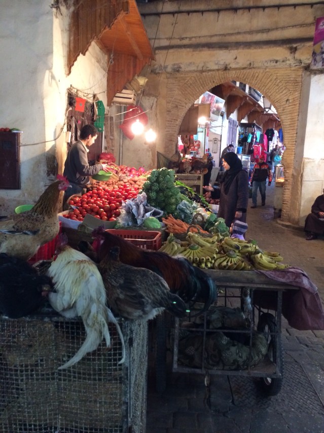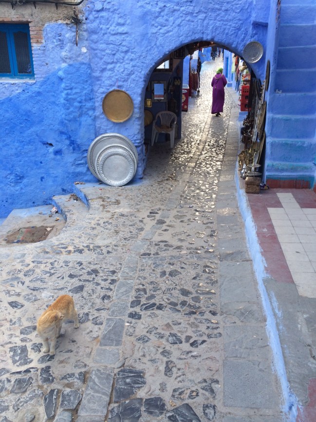 Fes wouldn’t appeal to everyone. But I liked it so much I felt sad to leave. As we bounced along on the bus out of town, heading to Chefchaouen, Steve and I agreed we’ve never experienced any place quite like the medina — in all our travels. The closest comparison we could make was with Venice, another ancient city that’s a maze of twisty narrow passages and a sanctuary from all forms of motorized traffic. I’ve read that Fes’s medina (where we spent almost all our time) is the largest pedestrian-only zone on Earth — home to something like half a million people. But unlike Barcelona’s old quarter or Venice, the Fes medina isn’t an enclave of monied professionals or trust-fund babies, but home to folks who sell live chickens and cure animals skins in reeking vats of urine and pigeon excrement and beat copper into beautiful bowls and drive donkeys laden with propane cannisters, eking out livings in those and a thousand other ways. It’s not really medieval. Today the streets are (mostly) lined with cobblestones, and pipes deliver running water. There’s electric light, and people use cell phones and ATM machines and wi-fi. But these things have arrived within just the past few decades, and the presence of the way life was for the thousand preceding years is palpable.