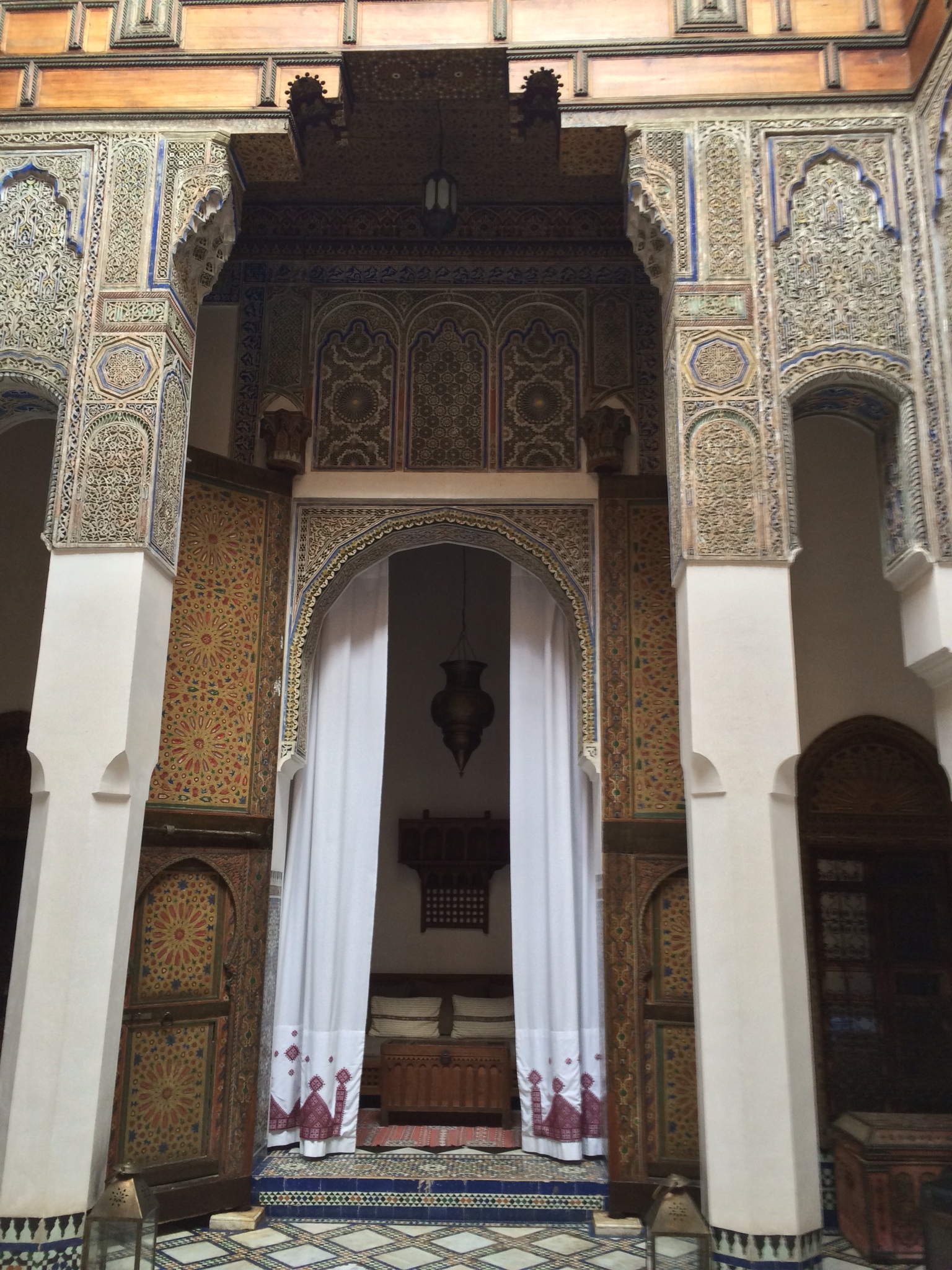 Happily, it all worked out. The riad found a reliable driver who was already at the airport, so I had to wait almost no time at all. He drove me to the walls of the enormous old city, when we transferred the bags to a guy with a wooden cart. We followed him on foot through passages that seemed darker and older and far more confusing than the ones in Marrakech. Finally, at the end of a dimly lighted dead end, we rang a bell next to an impressive wooden door, and I was admitted to Dar Seffarine.