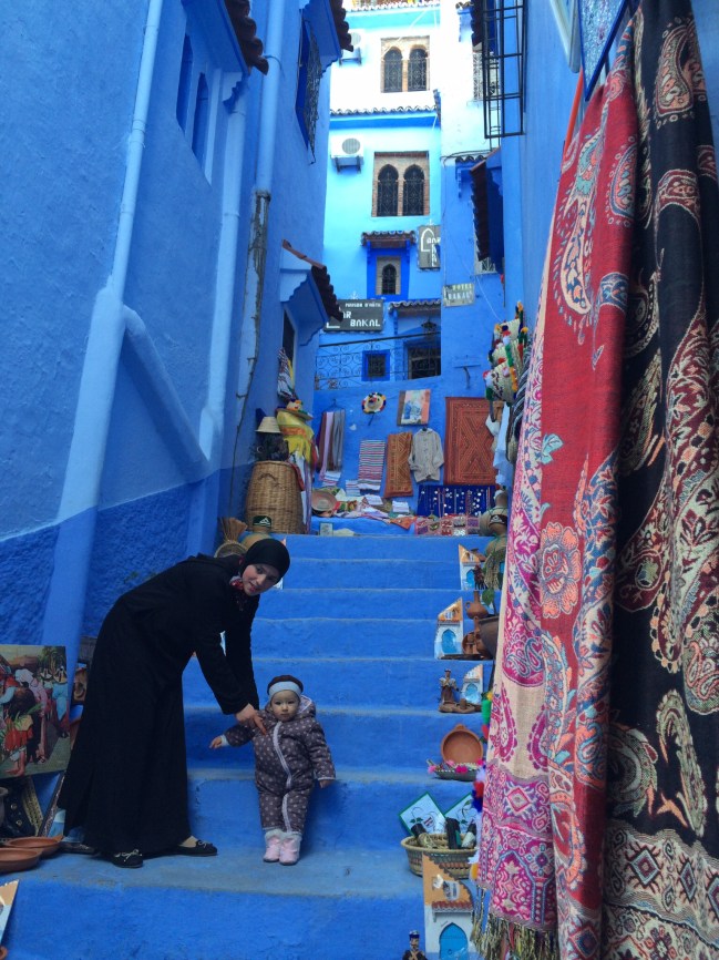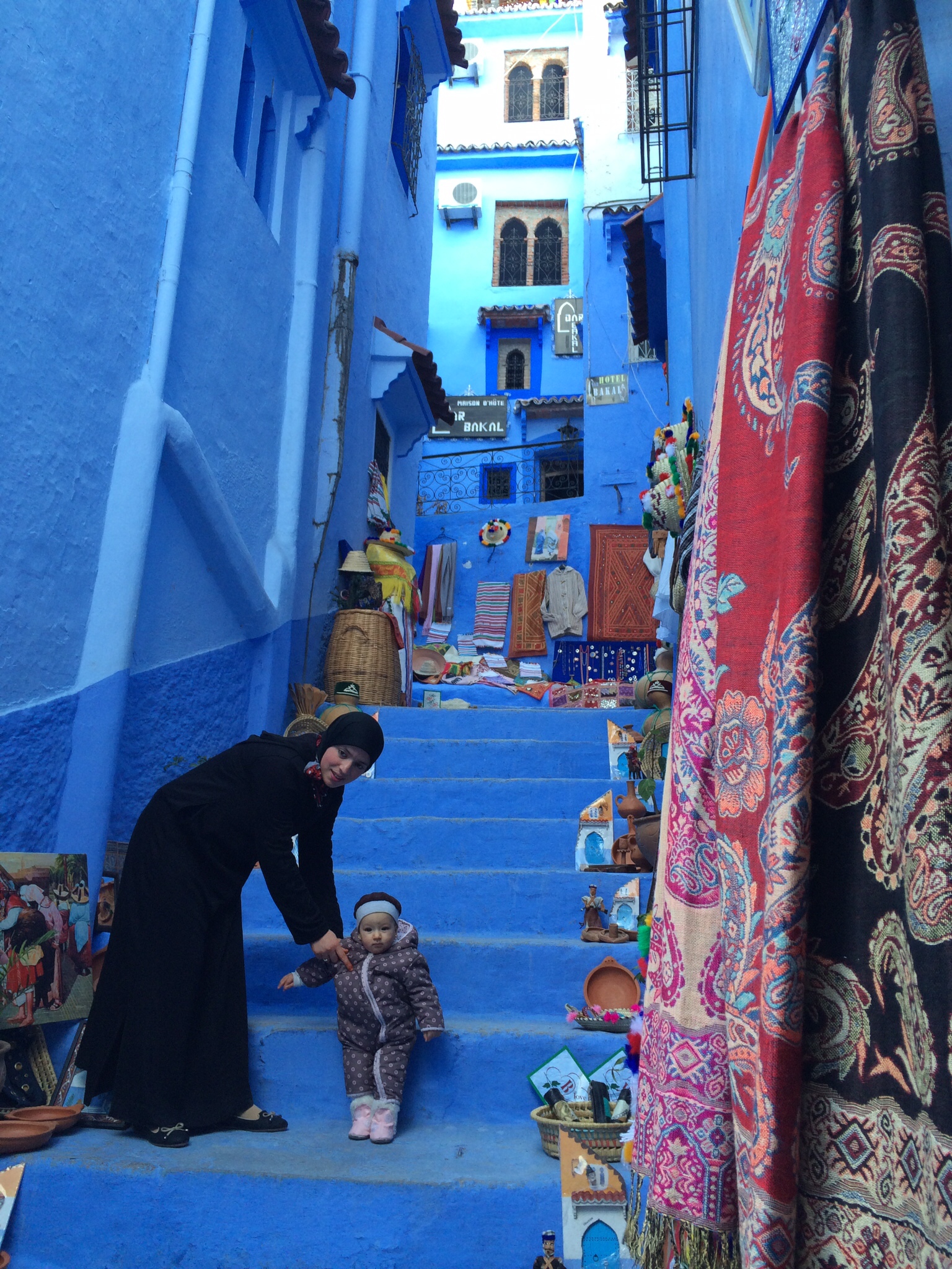 Another bend in the road, another surprising facet of this country. Our bus from Fes took us through verdant, bountiful farm country, but finally we approached the Rif Mountains, a brawny land that made Steve and me feel we were deep within the Rockies. After about 90 minutes, we pulled into a rest stop, where everyone rushed out to use the toilets but then dawdled to smoke and buy snacks and gab. When the driver finally climbed back aboard, he discovered that one passenger was missing. He tooted the horn (and tooted and tooted) and then searched the rest stop for him. Then he gave up and we trundled onto the road again. It struck me that the TSA would be more suspicious of a passenger who simply disappeared. But the bus didn’t blow up, and we reached Chefchaouen only about 40 minutes late.