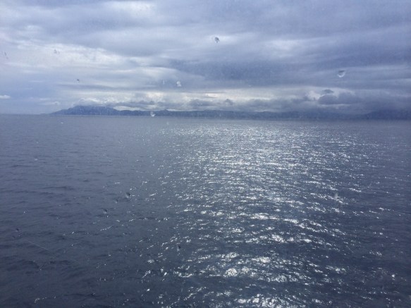 It was a gray, blustery, showery day, but that didn’t dampen our spirits, once underway. Steve and I both are such suckers for geography we felt like four-year-olds about to sit on Santa’s lap, as we entered that famous channel between the Atlantic Ocean and the Mediterranean Sea. Steve marveled over its historic significance (“The most strategically important waterway in human history!”) while I goggled over the misty coasts — Africa on my right, Europe on my left, both easily visible. On that right-hand coast, I could disembark and WALK to the pyramids of Egypt, the mountain gorillas of Uganda, the gold mines of Johannesburg (if I were crazy, and the logistics weren’t an issue.) Ranging out from other side would take me back to Paris and beyond.