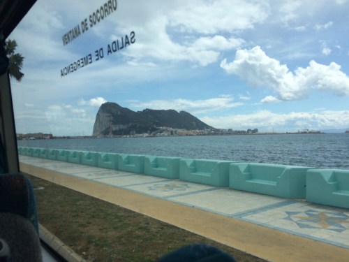 We landed in the Spanish town of Tarifa, where we followed many of our fellow passengers onto a free shuttle bus bound for Alcegiras (the town where ferries from the farther Moroccan ferry terminal wind up.) By this point, the sun had emerged, and the hilly green countryside looked beautiful. The Alcegiras ferry terminal seemed relatively empty, but there was a lady in the information booth, and she assured us we could walk to the town bus station in about 10 minutes and there find a local bus to La Linea de la Concepcion (the Spanish town that actually DOES butt up against the British possession of Gibraltar.)