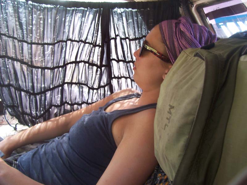 We all got hassled, but she again the worst of all of us, at the sleepy Senegal/Guinea Bissau border. When an official waved our sept-place over to the side of the road, we had to pry ourselves out of the vehicle and extract every piece of our baggage, then haul it over to the back of an unmarked pickup truck parked under a huge tree. There, a guy wearing a Police baseball cap made us put each piece, one by one, on the tailgate. He opened every single bag, and every single receptacle within; all our medicine/first aid bags, my makeup case, all the inner pockets of my purse, even the box of matches within one of those. Heavy-lidded, he studied each item, neither polite nor surly, an automaton going through the motions. Finally we repacked and loaded all the luggage and he returned each of our passports, except for Laura’s; he said he was going to detain her. She acted exasperated, then disgusted. She called our driver over to intercede. Eventually, the official relinquished her passport with a leer. “They just want to flirt,” she said to us with a roll of her eyes. “They have nothing else to do all day.”