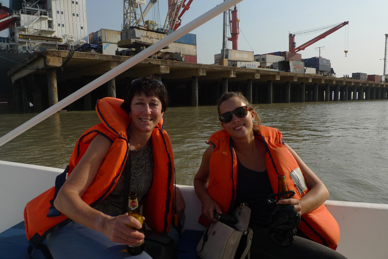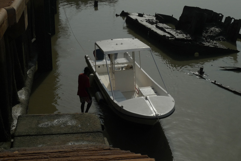 But around 3:30 p.m. — when we were a full 90 minutes late for meeting the speedboat in Bissau that we’d hired to take us out to Bubaque Island — it began to grate on our nerves as it had been irritating Laura and our three African fellow passengers all along. Two of the latter were natives of Bissau (and speakers of English as well as Wolof, Portuguese, and some French). Friendly folks, they helped us find a taxi and direct the driver to the container port where Gilles had said we’d find the speedboat.