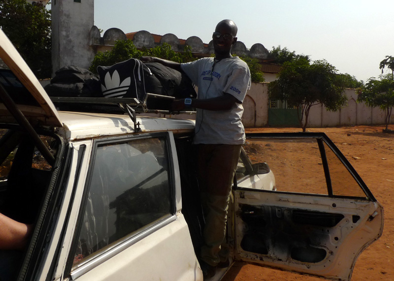 The bribe came as we were returning from Guinea Bissau. We’d had two choices of travel routes back to Senegal: 1) returning to Ziguinchor and then heading east to Kolda, or 2) traveling east to a town called Bafata and from thence north to Kolda. We’d had such a dreadful time with all the checkpoints on the way from Zig that we decided to try the second, even though we’d been warned that the roads were dreadful. Happily, they actually weren’t all that bad, although once again, the travel was pricy. Despite hard bargaining, we’d had to pay about $100 for a bush taxi to get us from Bissau to the border (for that, we got the whole vehicle.) Bizarrely, all the taxis in GB were in hugely better condition than those in Senegal and the Gambia. In Bissau, they were all Mercedes Benzes, not that ancient, and our sept-place to the border was a remarkably clean and comfortable Renault. (Steve suspects there’s some convoluted explanation involving foreign aid and government contracts to explain this.)