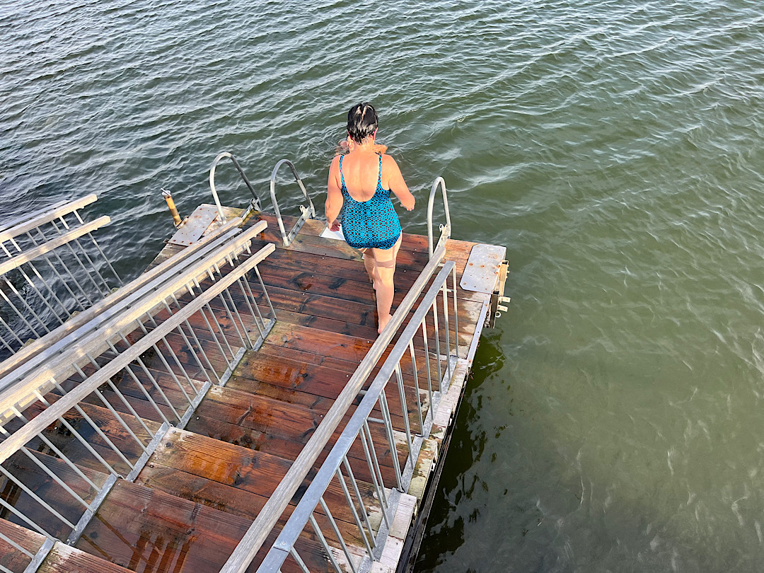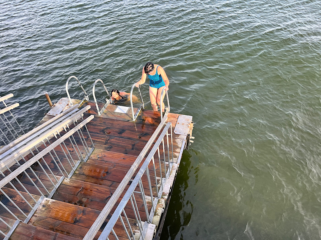 She’d already gotten into the sea a couple of times, she told us; her evident survival inspired me. When I felt close to fainting from the heat, I signaled to Steve I was ready to take the plunge. At Löyly, you don’t literally jump into the Baltic (actually the Gulf of Finland); rather you walk to the end of a platform and descend a ladder. Normally, I’m someone who can’t enter a 75-degree swimming pool without shrieking. But this water was so cold it belonged to a different realm.