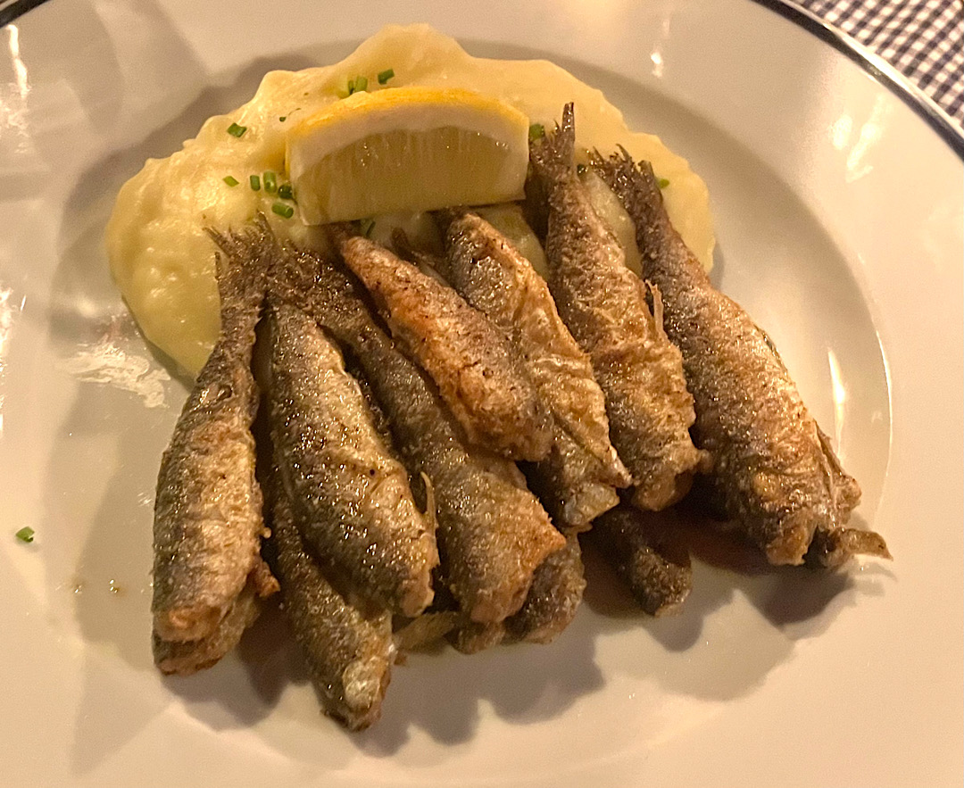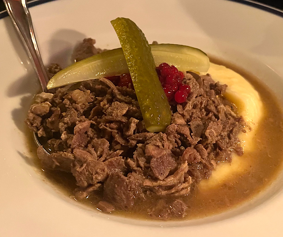 I would have cycled between the heat and cold a few more times, but we had to shower, dress, and move on to our final dinner before starting the journey home. Steve ordered sautéed reindeer, while I savored little whitefish known as vendace, breaded, fried, and served on a mound of buttery mashed potatoes.
