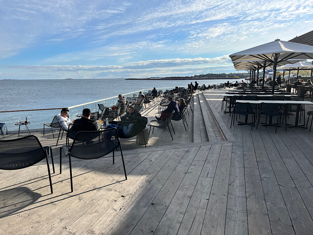 Visiting a sex-segregated facility, where the ladies and gents (usually naked) swelter separately seemed creepier than patronizing a sauna where Steve and I could don bathing suits and sweat together. The upscale Löyly offered this option. Housed in a low-slung wooden building on the waterfront, it took about 20 minutes to walk to it from our flat. An inviting bar and restaurant takes up a big chunk of the complex.
