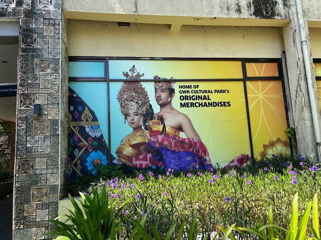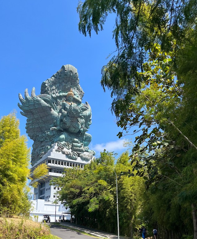 Why were THEY here? What were they? Our 2021 edition of Lonely Planet Indonesia, incredibly, didn’t even mention the GWK cultural park. In the first-floor lobby that underlies the gigantic statue of Vishnu riding on Arjuna, we found some historical photos that hinted at why. The center apparently was only inaugurated in the fall of 2018, and we imagine the guidebook went to press before that. After our visit, we found a bit more information on Wikipedia, which explained that the park began as a government project, then construction shut down when the Asian financial crisis hit in the late 90s. A Balinese real-estate developer finally stepped in to take over the project and finish it. But nowhere in the park or online could we find an explanation for those monoliths. (Our theory is that the land originally was a rock quarry, and the monoliths were remnants of the original stone. But we don’t know if that’s right.)