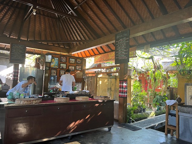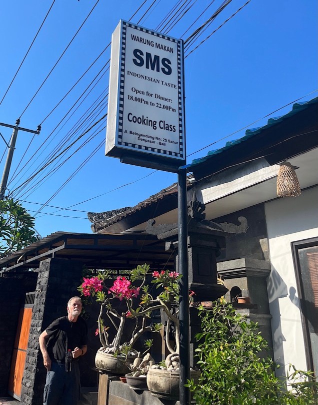 Then we drove to his base in the community of Sanur, a combination of family home, restaurant, and the classroom in which Mudana teaches foreigners how to cook like a Balinese. Here’s the street front: