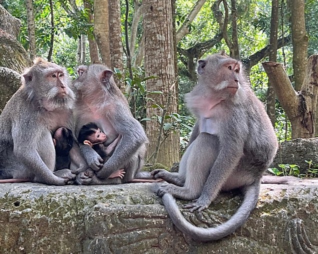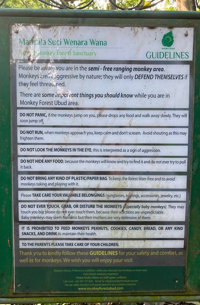 On our way back to the villa, I didn’t want to miss the infamous Ubud Monkey Forest, a heavily wooded park inhabited by hundreds of Balinese macaques. The property also contains a temple used daily by Hindu worshippers, and the monkeys are believed to have some religious or spiritual significance. At least I think so. As usual for Indonesia, educational and explanatory material was non-existent. Many signs warned visitors not to get close to the monkeys, who could be aggressive and malicious, according to the warnings, stealing glasses and cell phones and the like.