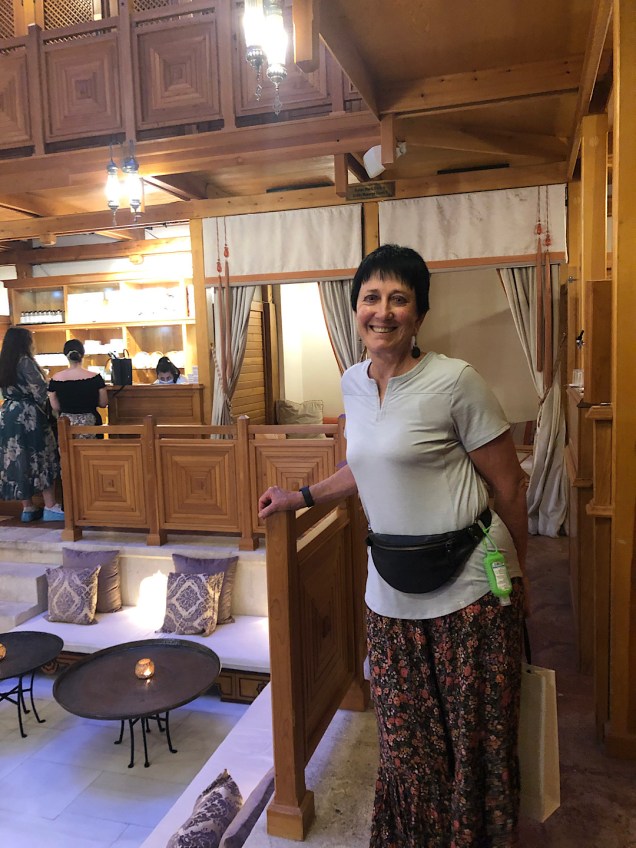 I think many elements of what we experienced over the ensuing two hours and 20 minutes are standard features of a Turkish bath, as it has long been carried out in this part of the world. But I can’t imagine it being done in a more sumptuous manner. We had signed up for The Works, and the process started with our being led to beautiful wood-paneled dressing roomswhere we shed all our clothes and donned tiny string thongs, shower slippers, and bathrobes. We each had our own personal attendant who led us to an inner sanctum under a graceful, light-filled dome. Directly under it was a six- or eight-sided marble platform. I can’t be specific in part because I couldn’t take a camera or notebook into that hot, steamy enclave filled with naked women of all ages, sizes, shapes, and colors. Even the attendants wear nothing but towels wrapped around them and tucked in over their breasts and at their upper thighs.