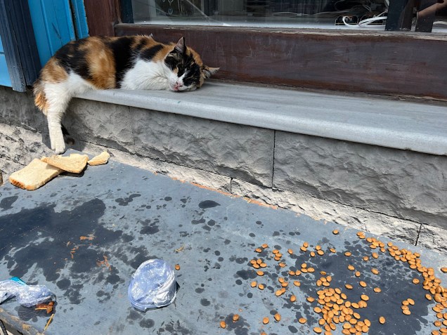 This kitten was unusually bold about requesting some of my fish scraps.But folks seems to share enough that many of the strays need not beg for food.Is it dog chow? Cat chow? You see little piles of both.