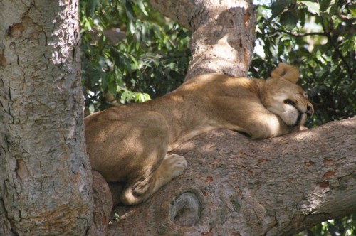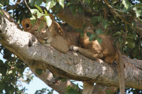 All lions can climb trees, he pointed out. But what makes the Ishasha area of the national park famous for its tree-climbing lions is that a few huge fig trees are scattered (widely) amidst the legions of acacia. And, unlike the short acacias, the mature fig trees grow stout horizontal branches that make wonderful resting places for lions. High off the ground, they’re well-positioned to catch a cool breeze, escape attack from the tsetse flies that infest this area, and spot the most likely direction in which dinner might lie, come the evening hunting session.
